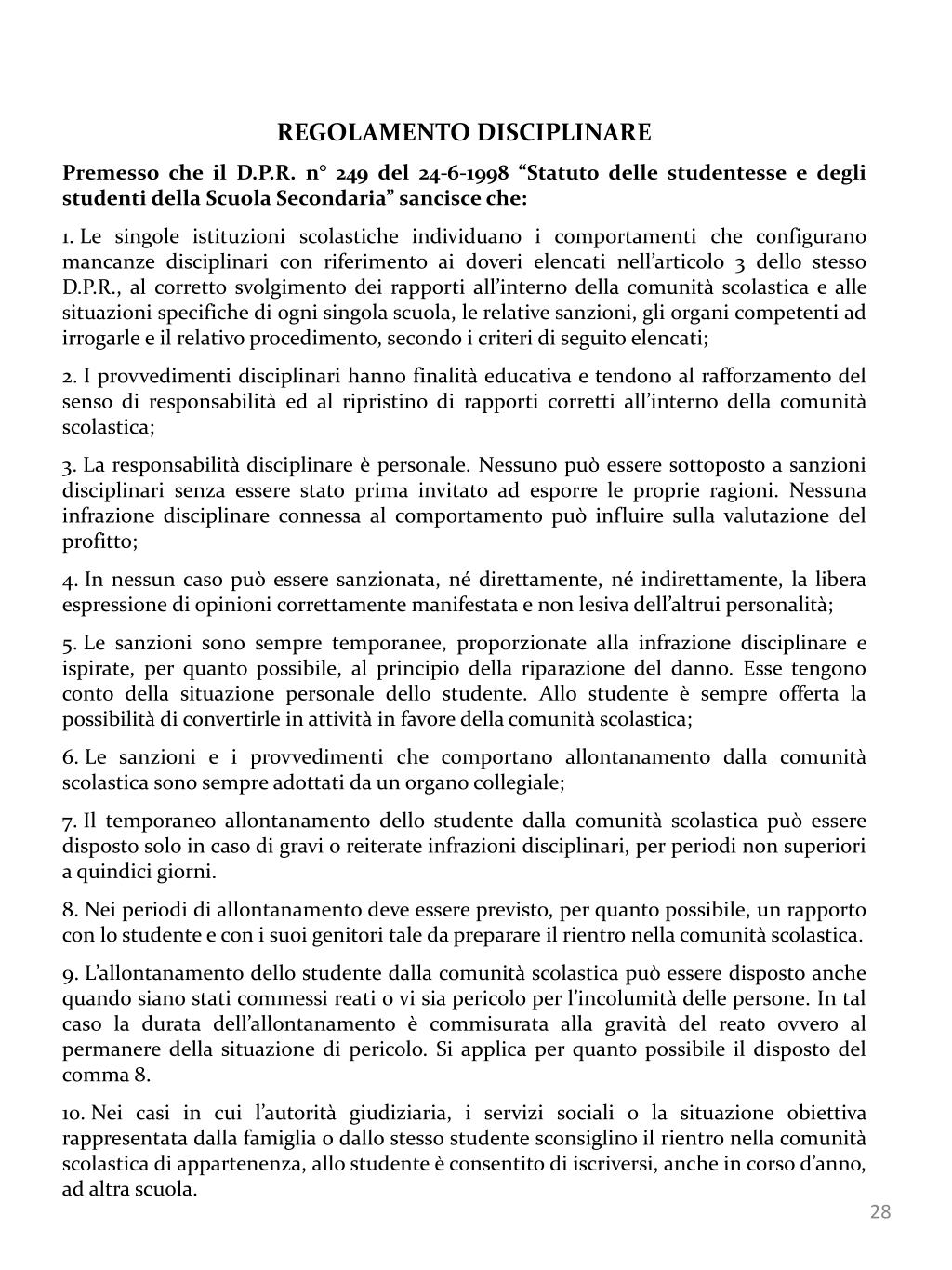 REGOLAMENTO DISCIPLINARE • Premesso che il D.P.R. n° 249 del 24-6-1998 “Statuto delle studentesse e degli studenti della Scuola Secondaria” sancisce che: • Le singole istituzioni scolastiche individuano i comportamenti che configurano mancanze disciplinari con riferimento ai doveri elencati nell’articolo 3 dello stesso D.P.R., al corretto svolgimento dei rapporti all’interno della comunità scolastica e alle situazioni specifiche di ogni singola scuola, le relative sanzioni, gli organi competenti ad irrogarle e il relativo procedimento, secondo i criteri di seguito elencati; • I provvedimenti disciplinari hanno finalità educativa e tendono al rafforzamento del senso di responsabilità ed al ripristino di rapporti corretti all’interno della comunità scolastica; • La responsabilità disciplinare è personale. Nessuno può essere sottoposto a sanzioni disciplinari senza essere stato prima invitato ad esporre le proprie ragioni. Nessuna infrazione disciplinare connessa al comportamento può influire sulla valutazione del profitto; • In nessun caso può essere sanzionata, né direttamente, né indirettamente, la libera espressione di opinioni correttamente manifestata e non lesiva dell’altrui personalità; • Le sanzioni sono sempre temporanee, proporzionate alla infrazione disciplinare e ispirate, per quanto possibile, al principio della riparazione del danno. Esse tengono conto della situazione personale dello studente. Allo studente è sempre offerta la possibilità di convertirle in attività in favore della comunità scolastica; • Le sanzioni e i provvedimenti che comportano allontanamento dalla comunità scolastica sono sempre adottati da un organo collegiale; • Il temporaneo allontanamento dello studente dalla comunità scolastica può essere disposto solo in caso di gravi o reiterate infrazioni disciplinari, per periodi non superiori a quindici giorni. • Nei periodi di allontanamento deve essere previsto, per quanto possibile, un rapporto con lo studente e con i suoi genitori tale da preparare il rientro nella comunità scolastica. • L’allontanamento dello studente dalla comunità scolastica può essere disposto anche quando siano stati commessi reati o vi sia pericolo per l’incolumità delle persone. In tal caso la durata dell’allontanamento è commisurata alla gravità del reato ovvero al permanere della situazione di pericolo. Si applica per quanto possibile il disposto del comma 8. • Nei casi in cui l’autorità giudiziaria, i servizi sociali o la situazione obiettiva rappresentata dalla famiglia o dallo stesso studente sconsiglino il rientro nella comunità scolastica di appartenenza, allo studente è consentito di iscriversi, anche in corso d’anno, ad altra scuola.