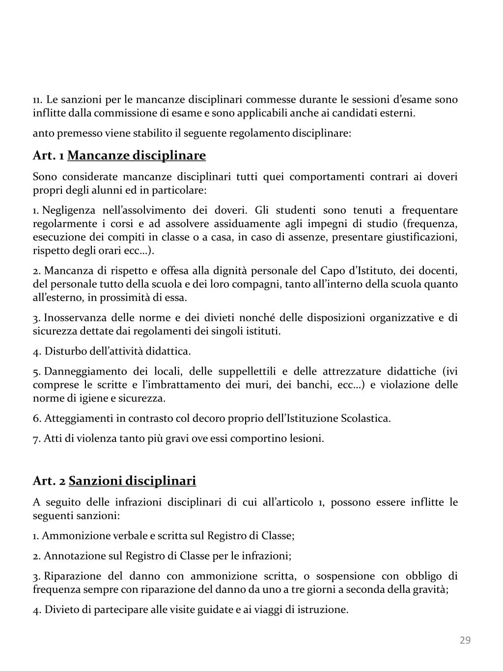 11. Le sanzioni per le mancanze disciplinari commesse durante le sessioni d’esame sono inflitte dalla commissione di esame e sono applicabili anche ai candidati esterni. • anto premesso viene stabilito il seguente regolamento disciplinare: • Art. 1 Mancanze disciplinare • Sono considerate mancanze disciplinari tutti quei comportamenti contrari ai doveri propri degli alunni ed in particolare: • Negligenza nell’assolvimento dei doveri. Gli studenti sono tenuti a frequentare regolarmente i corsi e ad assolvere assiduamente agli impegni di studio (frequenza, esecuzione dei compiti in classe o a casa, in caso di assenze, presentare giustificazioni, rispetto degli orari ecc…). • Mancanza di rispetto e offesa alla dignità personale del Capo d’Istituto, dei docenti, del personale tutto della scuola e dei loro compagni, tanto all’interno della scuola quanto all’esterno, in prossimità di essa. • Inosservanza delle norme e dei divieti nonché delle disposizioni organizzative e di sicurezza dettate dai regolamenti dei singoli istituti. • Disturbo dell’attività didattica. • Danneggiamento dei locali, delle suppellettili e delle attrezzature didattiche (ivi comprese le scritte e l’imbrattamento dei muri, dei banchi, ecc…) e violazione delle norme di igiene e sicurezza. • Atteggiamenti in contrasto col decoro proprio dell’Istituzione Scolastica. • Atti di violenza tanto più gravi ove essi comportino lesioni. • Art. 2 Sanzioni disciplinari • A seguito delle infrazioni disciplinari di cui all’articolo 1, possono essere inflitte le seguenti sanzioni: • Ammonizione verbale e scritta sul Registro di Classe; • Annotazione sul Registro di Classe per le infrazioni; • Riparazione del danno con ammonizione scritta, o sospensione con obbligo di frequenza sempre con riparazione del danno da uno a tre giorni a seconda della gravità; • Divieto di partecipare alle visite guidate e ai viaggi di istruzione.