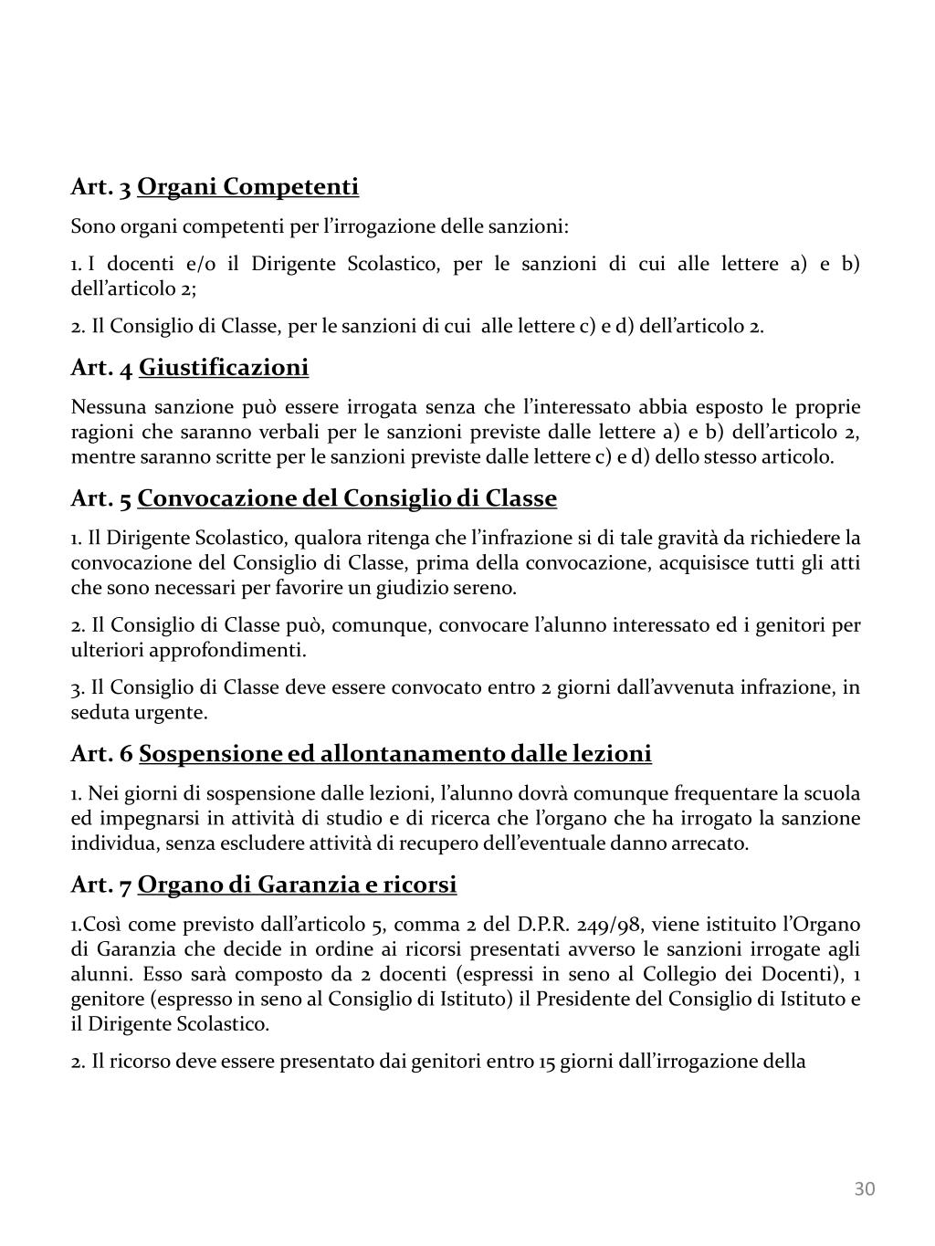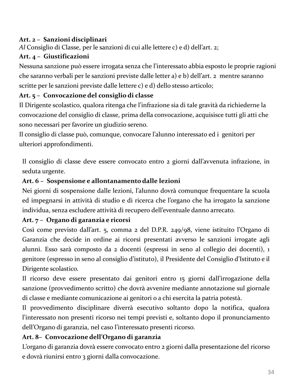 Art. 2 – Sanzioni disciplinari Al Consiglio di Classe, per le sanzioni di cui alle lettere c) e d) dell’art. 2; Art. 4 – Giustificazioni Nessuna sanzione può essere irrogata senza che l’interessato abbia esposto le proprie ragioni che saranno verbali per le sanzioni previste dalle letter a) e b) dell’art. 2 mentre saranno scritte per le sanzioni previste dalle lettere c) e d) dello stesso articolo; Art. 5 – Convocazione del consiglio di classe Il Dirigente scolastico, qualora ritenga che l’infrazione sia di tale gravità da richiederne la convocazione del consiglio di classe, prima della convocazione, acquisisce tutti gli atti che sono necessari per favorire un giudizio sereno. Il consiglio di classe può, comunque, convocare l’alunno interessato ed i genitori per ulteriori approfondimenti. Il consiglio di classe deve essere convocato entro 2 giorni dall’avvenuta infrazione, in seduta urgente. Art. 6 – Sospensione e allontanamento dalle lezioni Nei giorni di sospensione dalle lezioni, l’alunno dovrà comunque frequentare la scuola ed impegnarsi in attività di studio e di ricerca che l’organo che ha irrogato la sanzione individua, senza escludere attività di recupero dell’eventuale danno arrecato. Art. 7 – Organo di garanzia e ricorsi Così come previsto dall’art. 5, comma 2 del D.P.R. 249/98, viene istituito l’Organo di Garanzia che decide in ordine ai ricorsi presentati avverso le sanzioni irrogate agli alunni. Esso sarà composto da 2 docenti (espressi in seno al collegio dei docenti), 1 genitore (espresso in seno al consiglio d’istituto), il Presidente del Consiglio d’Istituto e il Dirigente scolastico. Il ricorso deve essere presentato dai genitori entro 15 giorni dall’irrogazione della sanzione (provvedimento scritto) che dovrà avvenire mediante annotazione sul giornale di classe e mediante comunicazione ai genitori o a chi esercita la patria potestà. Il provvedimento disciplinare diverrà esecutivo soltanto dopo la notifica, qualora l’interessato non presenti ricorso nei tempi previsti e, soltanto dopo il pronunciamento dell’Organo di garanzia, nel caso l’interessato presenti ricorso. Art. 8– Convocazione dell’Organo di garanzia L’organo di garanzia dovrà essere convocato entro 2 giorni dalla presentazione del ricorso e dovrà riunirsi entro 3 giorni dalla convocazione.