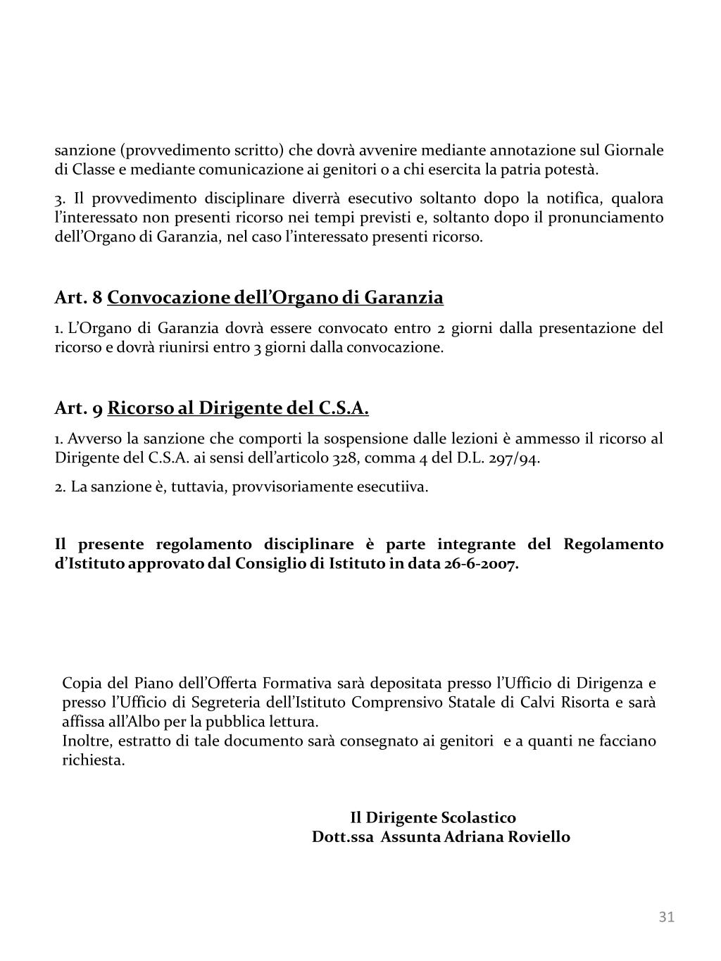 sanzione (provvedimento scritto) che dovrà avvenire mediante annotazione sul Giornale di Classe e mediante comunicazione ai genitori o a chi esercita la patria potestà. • 3. Il provvedimento disciplinare diverrà esecutivo soltanto dopo la notifica, qualora l’interessato non presenti ricorso nei tempi previsti e, soltanto dopo il pronunciamento dell’Organo di Garanzia, nel caso l’interessato presenti ricorso. • Art. 8 Convocazione dell’Organo di Garanzia • L’Organo di Garanzia dovrà essere convocato entro 2 giorni dalla presentazione del ricorso e dovrà riunirsi entro 3 giorni dalla convocazione. • Art. 9 Ricorso al Dirigente del C.S.A. • Avverso la sanzione che comporti la sospensione dalle lezioni è ammesso il ricorso al Dirigente del C.S.A. ai sensi dell’articolo 328, comma 4 del D.L. 297/94. • La sanzione è, tuttavia, provvisoriamente esecutiiva. • Il presente regolamento disciplinare è parte integrante del Regolamento d’Istituto approvato dal Consiglio di Istituto in data 26-6-2007. Copia del Piano dell’Offerta Formativa sarà depositata presso l’Ufficio di Dirigenza e presso l’Ufficio di Segreteria dell’Istituto Comprensivo Statale di Calvi Risorta e sarà affissa all’Albo per la pubblica lettura. Inoltre, estratto di tale documento sarà consegnato ai genitori e a quanti ne facciano richiesta. Il Dirigente Scolastico Dott.ssa Assunta Adriana Roviello