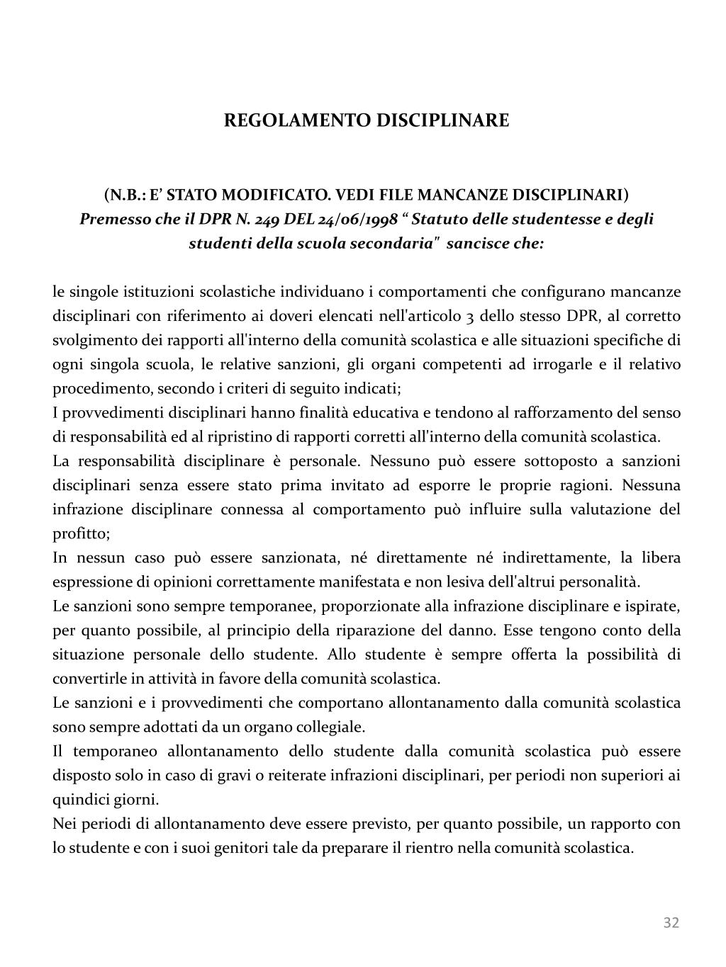 REGOLAMENTO DISCIPLINARE (N.B.: E’ STATO MODIFICATO. VEDI FILE MANCANZE DISCIPLINARI) Premesso che il DPR N. 249 DEL 24/06/1998 “ Statuto delle studentesse e degli studenti della scuola secondaria" sancisce che: le singole istituzioni scolastiche individuano i comportamenti che configurano mancanze disciplinari con riferimento ai doveri elencati nell'articolo 3 dello stesso DPR, al corretto svolgimento dei rapporti all'interno della comunità scolastica e alle situazioni specifiche di ogni singola scuola, le relative sanzioni, gli organi competenti ad irrogarle e il relativo procedimento, secondo i criteri di seguito indicati; I provvedimenti disciplinari hanno finalità educativa e tendono al rafforzamento del senso di responsabilità ed al ripristino di rapporti corretti all'interno della comunità scolastica. La responsabilità disciplinare è personale. Nessuno può essere sottoposto a sanzioni disciplinari senza essere stato prima invitato ad esporre le proprie ragioni. Nessuna infrazione disciplinare connessa al comportamento può influire sulla valutazione del profitto; In nessun caso può essere sanzionata, né direttamente né indirettamente, la libera espressione di opinioni correttamente manifestata e non lesiva dell'altrui personalità. Le sanzioni sono sempre temporanee, proporzionate alla infrazione disciplinare e ispirate, per quanto possibile, al principio della riparazione del danno. Esse tengono conto della situazione personale dello studente. Allo studente è sempre offerta la possibilità di convertirle in attività in favore della comunità scolastica. Le sanzioni e i provvedimenti che comportano allontanamento dalla comunità scolastica sono sempre adottati da un organo collegiale. Il temporaneo allontanamento dello studente dalla comunità scolastica può essere disposto solo in caso di gravi o reiterate infrazioni disciplinari, per periodi non superiori ai quindici giorni. Nei periodi di allontanamento deve essere previsto, per quanto possibile, un rapporto con lo studente e con i suoi genitori tale da preparare il rientro nella comunità scolastica.