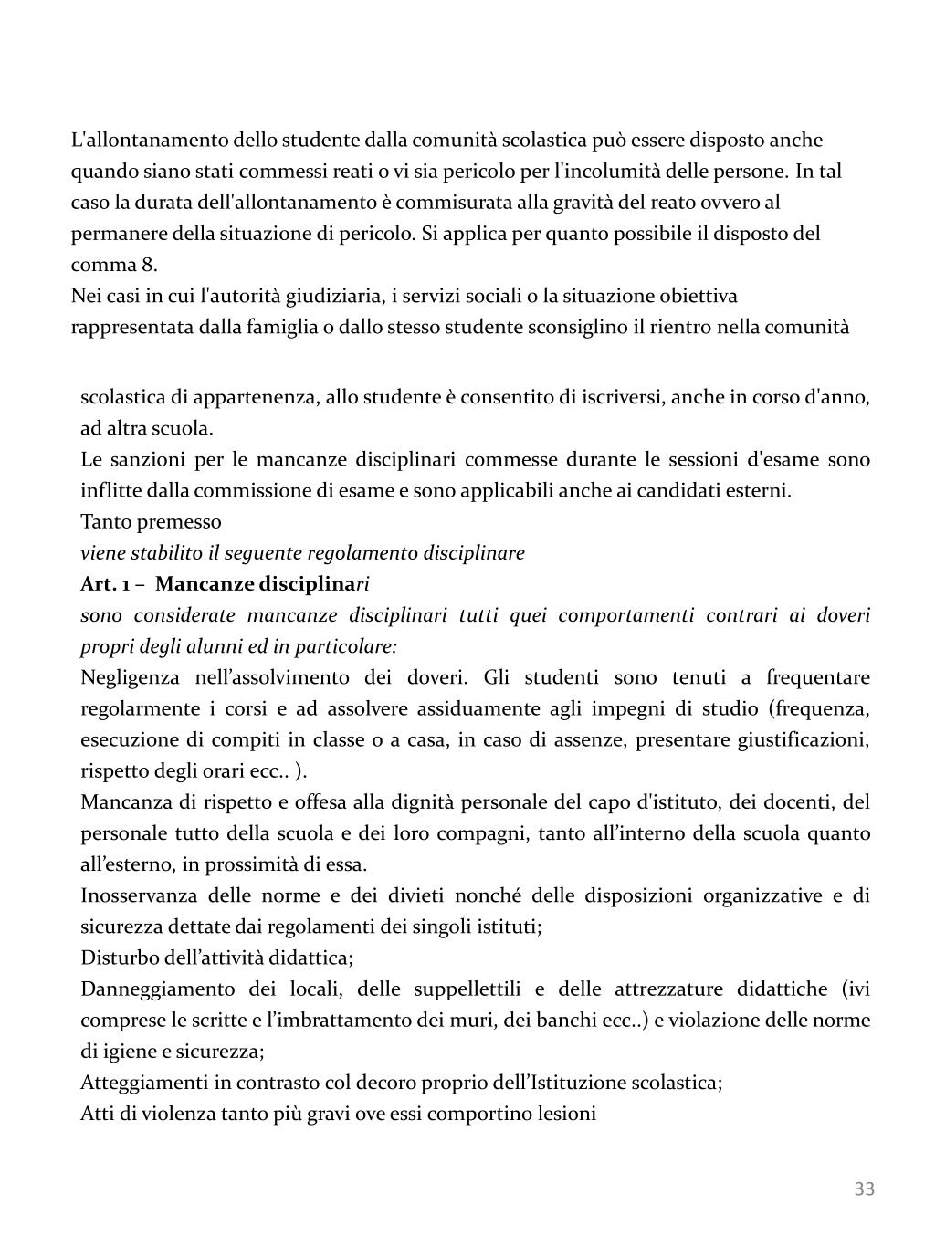 L'allontanamento dello studente dalla comunità scolastica può essere disposto anche quando siano stati commessi reati o vi sia pericolo per l'incolumità delle persone. In tal caso la durata dell'allontanamento è commisurata alla gravità del reato ovvero al permanere della situazione di pericolo. Si applica per quanto possibile il disposto del comma 8. Nei casi in cui l'autorità giudiziaria, i servizi sociali o la situazione obiettiva rappresentata dalla famiglia o dallo stesso studente sconsiglino il rientro nella comunità scolastica di appartenenza, allo studente è consentito di iscriversi, anche in corso d'anno, ad altra scuola. Le sanzioni per le mancanze disciplinari commesse durante le sessioni d'esame sono inflitte dalla commissione di esame e sono applicabili anche ai candidati esterni. Tanto premesso viene stabilito il seguente regolamento disciplinare Art. 1 – Mancanze disciplinari sono considerate mancanze disciplinari tutti quei comportamenti contrari ai doveri propri degli alunni ed in particolare: Negligenza nell’assolvimento dei doveri. Gli studenti sono tenuti a frequentare regolarmente i corsi e ad assolvere assiduamente agli impegni di studio (frequenza, esecuzione di compiti in classe o a casa, in caso di assenze, presentare giustificazioni, rispetto degli orari ecc.. ). Mancanza di rispetto e offesa alla dignità personale del capo d'istituto, dei docenti, del personale tutto della scuola e dei loro compagni, tanto all’interno della scuola quanto all’esterno, in prossimità di essa. Inosservanza delle norme e dei divieti nonché delle disposizioni organizzative e di sicurezza dettate dai regolamenti dei singoli istituti; Disturbo dell’attività didattica; Danneggiamento dei locali, delle suppellettili e delle attrezzature didattiche (ivi comprese le scritte e l’imbrattamento dei muri, dei banchi ecc..) e violazione delle norme di igiene e sicurezza; Atteggiamenti in contrasto col decoro proprio dell’Istituzione scolastica; Atti di violenza tanto più gravi ove essi comportino lesioni