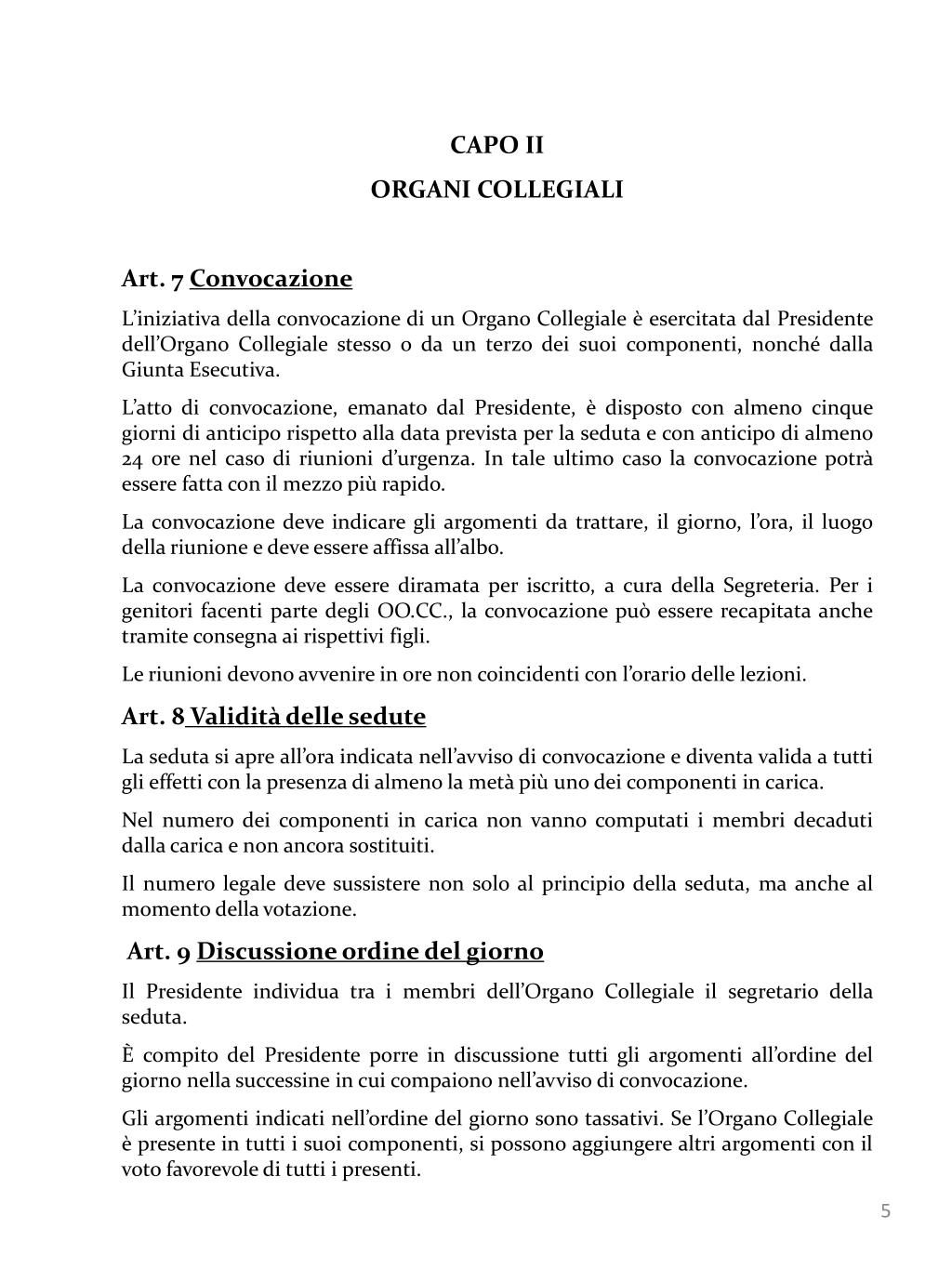 CAPO II ORGANI COLLEGIALI Art. 7 Convocazione L’iniziativa della convocazione di un Organo Collegiale è esercitata dal Presidente dell’Organo Collegiale stesso o da un terzo dei suoi componenti, nonché dalla Giunta Esecutiva. L’atto di convocazione, emanato dal Presidente, è disposto con almeno cinque giorni di anticipo rispetto alla data prevista per la seduta e con anticipo di almeno 24 ore nel caso di riunioni d’urgenza. In tale ultimo caso la convocazione potrà essere fatta con il mezzo più rapido. La convocazione deve indicare gli argomenti da trattare, il giorno, l’ora, il luogo della riunione e deve essere affissa all’albo. La convocazione deve essere diramata per iscritto, a cura della Segreteria. Per i genitori facenti parte degli OO.CC., la convocazione può essere recapitata anche tramite consegna ai rispettivi figli. Le riunioni devono avvenire in ore non coincidenti con l’orario delle lezioni. Art. 8 Validità delle sedute La seduta si apre all’ora indicata nell’avviso di convocazione e diventa valida a tutti gli effetti con la presenza di almeno la metà più uno dei componenti in carica. Nel numero dei componenti in carica non vanno computati i membri decaduti dalla carica e non ancora sostituiti. Il numero legale deve sussistere non solo al principio della seduta, ma anche al momento della votazione. Art. 9 Discussione ordine del giorno Il Presidente individua tra i membri dell’Organo Collegiale il segretario della seduta. È compito del Presidente porre in discussione tutti gli argomenti all’ordine del giorno nella successine in cui compaiono nell’avviso di convocazione. Gli argomenti indicati nell’ordine del giorno sono tassativi. Se l’Organo Collegiale è presente in tutti i suoi componenti, si possono aggiungere altri argomenti con il voto favorevole di tutti i presenti.