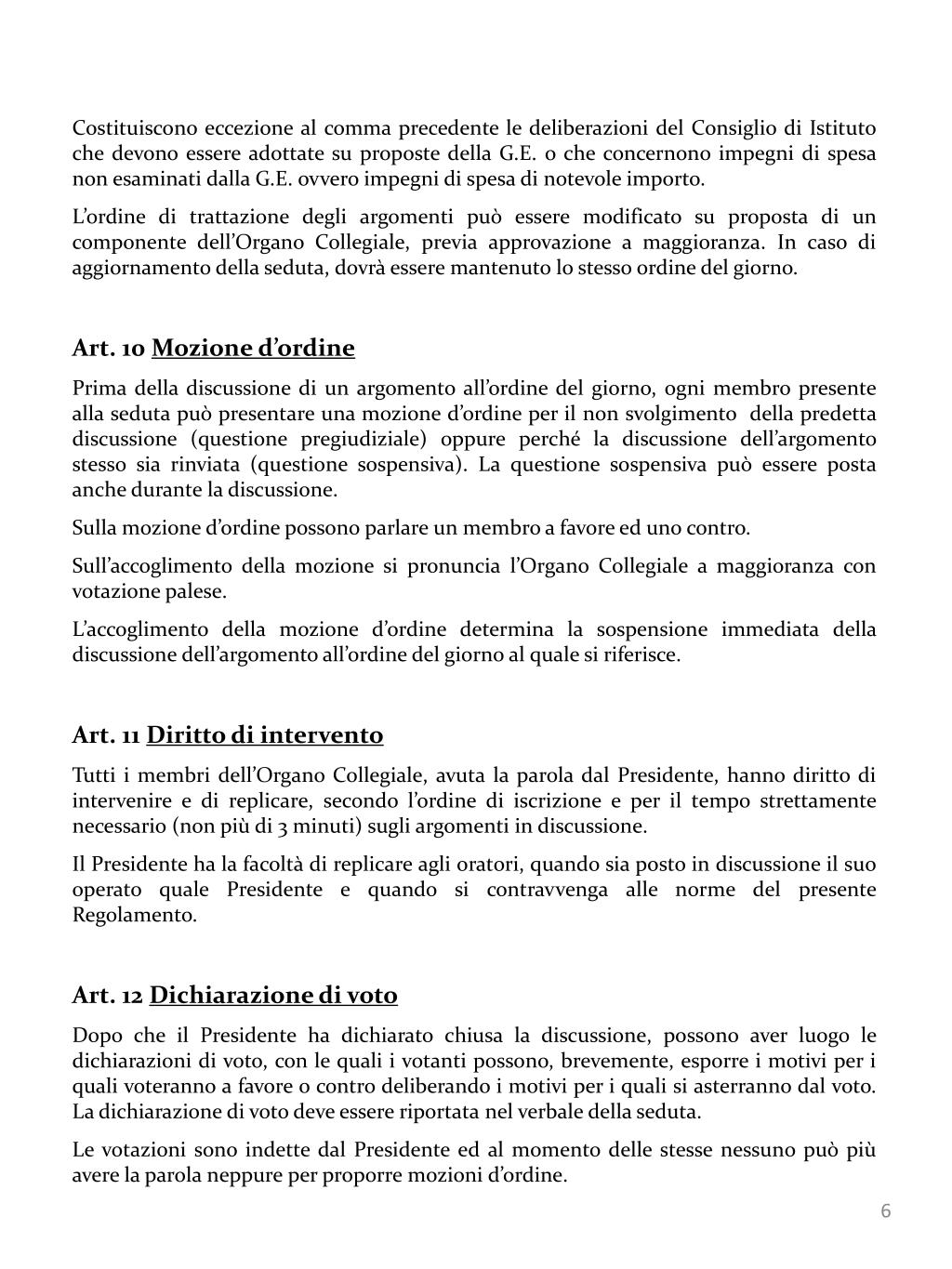Costituiscono eccezione al comma precedente le deliberazioni del Consiglio di Istituto che devono essere adottate su proposte della G.E. o che concernono impegni di spesa non esaminati dalla G.E. ovvero impegni di spesa di notevole importo. L’ordine di trattazione degli argomenti può essere modificato su proposta di un componente dell’Organo Collegiale, previa approvazione a maggioranza. In caso di aggiornamento della seduta, dovrà essere mantenuto lo stesso ordine del giorno. Art. 10 Mozione d’ordine Prima della discussione di un argomento all’ordine del giorno, ogni membro presente alla seduta può presentare una mozione d’ordine per il non svolgimento della predetta discussione (questione pregiudiziale) oppure perché la discussione dell’argomento stesso sia rinviata (questione sospensiva). La questione sospensiva può essere posta anche durante la discussione. Sulla mozione d’ordine possono parlare un membro a favore ed uno contro. Sull’accoglimento della mozione si pronuncia l’Organo Collegiale a maggioranza con votazione palese. L’accoglimento della mozione d’ordine determina la sospensione immediata della discussione dell’argomento all’ordine del giorno al quale si riferisce. Art. 11 Diritto di intervento Tutti i membri dell’Organo Collegiale, avuta la parola dal Presidente, hanno diritto di intervenire e di replicare, secondo l’ordine di iscrizione e per il tempo strettamente necessario (non più di 3 minuti) sugli argomenti in discussione. Il Presidente ha la facoltà di replicare agli oratori, quando sia posto in discussione il suo operato quale Presidente e quando si contravvenga alle norme del presente Regolamento. Art. 12 Dichiarazione di voto Dopo che il Presidente ha dichiarato chiusa la discussione, possono aver luogo le dichiarazioni di voto, con le quali i votanti possono, brevemente, esporre i motivi per i quali voteranno a favore o contro deliberando i motivi per i quali si asterranno dal voto. La dichiarazione di voto deve essere riportata nel verbale della seduta. Le votazioni sono indette dal Presidente ed al momento delle stesse nessuno può più avere la parola neppure per proporre mozioni d’ordine.