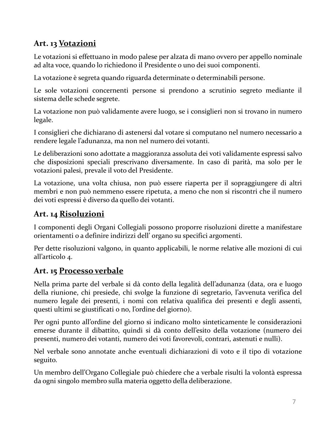 Art. 13 Votazioni Le votazioni si effettuano in modo palese per alzata di mano ovvero per appello nominale ad alta voce, quando lo richiedono il Presidente o uno dei suoi componenti. La votazione è segreta quando riguarda determinate o determinabili persone. Le sole votazioni concernenti persone si prendono a scrutinio segreto mediante il sistema delle schede segrete. La votazione non può validamente avere luogo, se i consiglieri non si trovano in numero legale. I consiglieri che dichiarano di astenersi dal votare si computano nel numero necessario a rendere legale l’adunanza, ma non nel numero dei votanti. Le deliberazioni sono adottate a maggioranza assoluta dei voti validamente espressi salvo che disposizioni speciali prescrivano diversamente. In caso di parità, ma solo per le votazioni palesi, prevale il voto del Presidente. La votazione, una volta chiusa, non può essere riaperta per il sopraggiungere di altri membri e non può nemmeno essere ripetuta, a meno che non si riscontri che il numero dei voti espressi è diverso da quello dei votanti. Art. 14Risoluzioni I componenti degli Organi Collegiali possono proporre risoluzioni dirette a manifestare orientamenti o a definire indirizzi dell’ organo su specifici argomenti. Per dette risoluzioni valgono, in quanto applicabili, le norme relative alle mozioni di cui all’articolo 4. Art. 15 Processo verbale Nella prima parte del verbale si dà conto della legalità dell’adunanza (data, ora e luogo della riunione, chi presiede, chi svolge la funzione di segretario, l’avvenuta verifica del numero legale dei presenti, i nomi con relativa qualifica dei presenti e degli assenti, questi ultimi se giustificati o no, l’ordine del giorno). Per ogni punto all’ordine del giorno si indicano molto sinteticamente le considerazioni emerse durante il dibattito, quindi si dà conto dell’esito della votazione (numero dei presenti, numero dei votanti, numero dei voti favorevoli, contrari, astenuti e nulli). Nel verbale sono annotate anche eventuali dichiarazioni di voto e il tipo di votazione seguito. Un membro dell’Organo Collegiale può chiedere che a verbale risulti la volontà espressa da ogni singolo membro sulla materia oggetto della deliberazione.