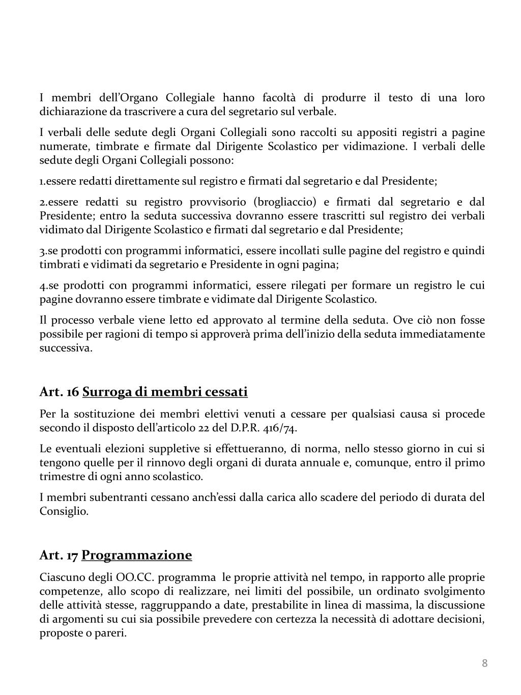 I membri dell’Organo Collegiale hanno facoltà di produrre il testo di una loro dichiarazione da trascrivere a cura del segretario sul verbale. • I verbali delle sedute degli Organi Collegiali sono raccolti su appositi registri a pagine numerate, timbrate e firmate dal Dirigente Scolastico per vidimazione. I verbali delle sedute degli Organi Collegiali possono: • essere redatti direttamente sul registro e firmati dal segretario e dal Presidente; • essere redatti su registro provvisorio (brogliaccio) e firmati dal segretario e dal Presidente; entro la seduta successiva dovranno essere trascritti sul registro dei verbali vidimato dal Dirigente Scolastico e firmati dal segretario e dal Presidente; • se prodotti con programmi informatici, essere incollati sulle pagine del registro e quindi timbrati e vidimati da segretario e Presidente in ogni pagina; • se prodotti con programmi informatici, essere rilegati per formare un registro le cui pagine dovranno essere timbrate e vidimate dal Dirigente Scolastico. • Il processo verbale viene letto ed approvato al termine della seduta. Ove ciò non fosse possibile per ragioni di tempo si approverà prima dell’inizio della seduta immediatamente successiva. • Art. 16 Surroga di membri cessati • Per la sostituzione dei membri elettivi venuti a cessare per qualsiasi causa si procede secondo il disposto dell’articolo 22 del D.P.R. 416/74. • Le eventuali elezioni suppletive si effettueranno, di norma, nello stesso giorno in cui si tengono quelle per il rinnovo degli organi di durata annuale e, comunque, entro il primo trimestre di ogni anno scolastico. • I membri subentranti cessano anch’essi dalla carica allo scadere del periodo di durata del Consiglio. • Art. 17 Programmazione • Ciascuno degli OO.CC. programma le proprie attività nel tempo, in rapporto alle proprie competenze, allo scopo di realizzare, nei limiti del possibile, un ordinato svolgimento delle attività stesse, raggruppando a date, prestabilite in linea di massima, la discussione di argomenti su cui sia possibile prevedere con certezza la necessità di adottare decisioni, proposte o pareri.