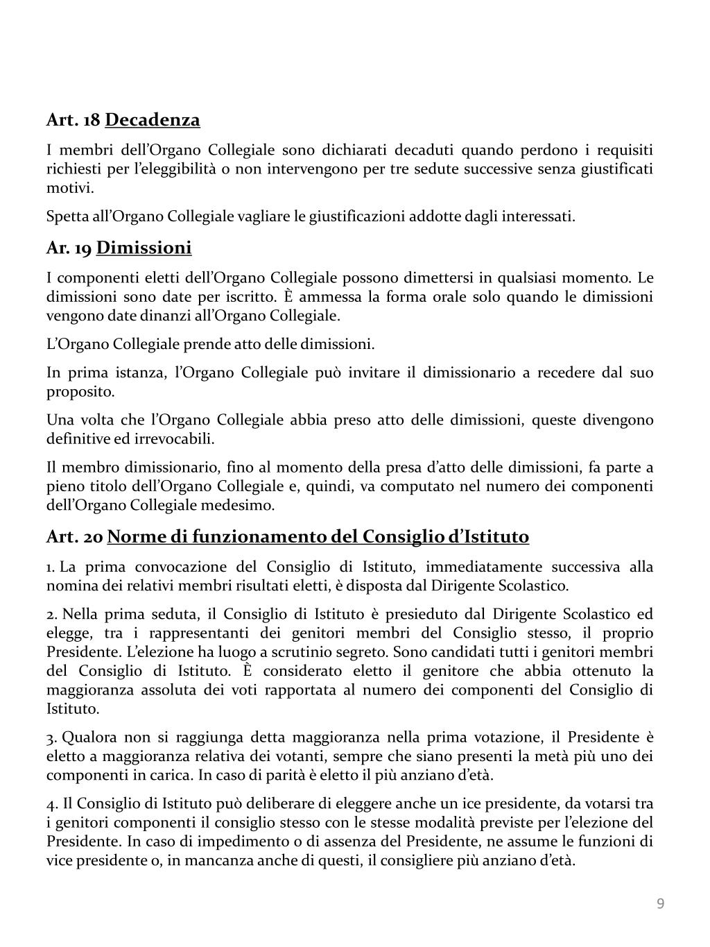 Art. 18 Decadenza • I membri dell’Organo Collegiale sono dichiarati decaduti quando perdono i requisiti richiesti per l’eleggibilità o non intervengono per tre sedute successive senza giustificati motivi. • Spetta all’Organo Collegiale vagliare le giustificazioni addotte dagli interessati. • Ar. 19 Dimissioni • I componenti eletti dell’Organo Collegiale possono dimettersi in qualsiasi momento. Le dimissioni sono date per iscritto. È ammessa la forma orale solo quando le dimissioni vengono date dinanzi all’Organo Collegiale. • L’Organo Collegiale prende atto delle dimissioni. • In prima istanza, l’Organo Collegiale può invitare il dimissionario a recedere dal suo proposito. • Una volta che l’Organo Collegiale abbia preso atto delle dimissioni, queste divengono definitive ed irrevocabili. • Il membro dimissionario, fino al momento della presa d’atto delle dimissioni, fa parte a pieno titolo dell’Organo Collegiale e, quindi, va computato nel numero dei componenti dell’Organo Collegiale medesimo. • Art. 20Norme di funzionamento del Consiglio d’Istituto • La prima convocazione del Consiglio di Istituto, immediatamente successiva alla nomina dei relativi membri risultati eletti, è disposta dal Dirigente Scolastico. • Nella prima seduta, il Consiglio di Istituto è presieduto dal Dirigente Scolastico ed elegge, tra i rappresentanti dei genitori membri del Consiglio stesso, il proprio Presidente. L’elezione ha luogo a scrutinio segreto. Sono candidati tutti i genitori membri del Consiglio di Istituto. È considerato eletto il genitore che abbia ottenuto la maggioranza assoluta dei voti rapportata al numero dei componenti del Consiglio di Istituto. • Qualora non si raggiunga detta maggioranza nella prima votazione, il Presidente è eletto a maggioranza relativa dei votanti, sempre che siano presenti la metà più uno dei componenti in carica. In caso di parità è eletto il più anziano d’età. • Il Consiglio di Istituto può deliberare di eleggere anche un ice presidente, da votarsi tra i genitori componenti il consiglio stesso con le stesse modalità previste per l’elezione del Presidente. In caso di impedimento o di assenza del Presidente, ne assume le funzioni di vice presidente o, in mancanza anche di questi, il consigliere più anziano d’età.