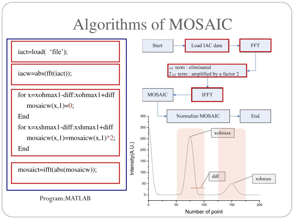 Algorithms of MOSAIC iact=load(‘file’); iacw=abs(fft(iact)); for x=xohmax1-diff:xohmax1+diff mosaicw(x,1)=0; End for x=xshmax1-diff:xshmax1+diff mosaicw(x,1)=mosaicw(x,1)*2; End mosaict=ifft(abs(mosaicw)); xohmax diff xshmax Program:MATLAB