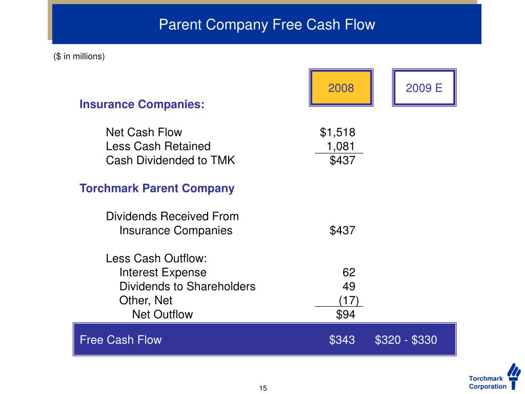 Insurance Companies Net Cash Flow ($ in millions) 2008 2009 E Cash From Operations Insurance Underwriting $485 Excess Investment Income 608 Income Taxes and Parent Expenses (180) $494 608 (171 ) Net Cash From Operations $931 $940 - $960 Investment Maturities 587 587 600 Net Cash Flow $1,518 $1,540 - $1,560 Torchmark Corporation 14