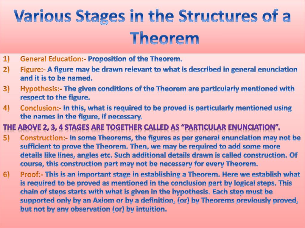 Various Stages in the Structures of a Theorem • General Education:- Proposition of the Theorem. • Figure:- A figure may be drawn relevant to what is described in general enunciation and it is to be named. • Hypothesis:- The given conditions of the Theorem are particularly mentioned with respect to the figure. • Conclusion:- In this, what is required to be proved is particularly mentioned using the names in the figure, if necessary. The above 2, 3, 4 stages are together called as “Particular Enunciation”. • Construction:- In some Theorems, the figures as per general enunciation may not be sufficient to prove the Theorem. Then, we may be required to add some more details like lines, angles etc. Such additional details drawn is called construction. Of course, this construction part may not be necessary for every Theorem. • Proof:- This is an important stage in establishing a Theorem. Here we establish what is required to be proved as mentioned in the conclusion part by logical steps. This chain of steps starts with what is given in the hypothesis. Each step must be supported only by an Axiom or by a definition, (or) by Theorems previously proved, but not by any observation (or) by intuition.