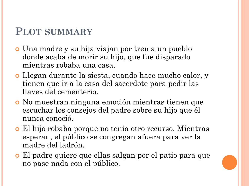 Plot summary • Una madre y su hija viajan por tren a un pueblo donde acaba de morir su hijo, que fue disparado mientras robaba una casa. • Llegan durante la siesta, cuando hace mucho calor, y tienen que ir a la casa del sacerdote para pedir las llaves del cementerio. • No muestran ninguna emoción mientras tienen que escuchar los consejos del padre sobre su hijo que él nunca conoció. • El hijo robaba porque no tenía otro recurso. Mientras esperan, el público se congregan afuera para ver la madre del ladrón. • El padre quiere que ellas salgan por el patio para que no pase nada con el público.