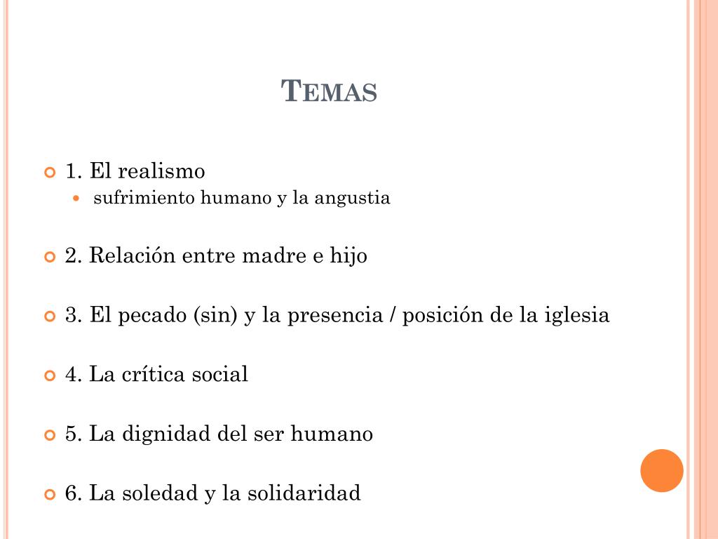 Temas • 1. El realismo • sufrimiento humano y la angustia • 2. Relación entre madre e hijo • 3. El pecado (sin) y la presencia / posición de la iglesia • 4. La crítica social • 5. La dignidad del ser humano • 6. La soledad y la solidaridad