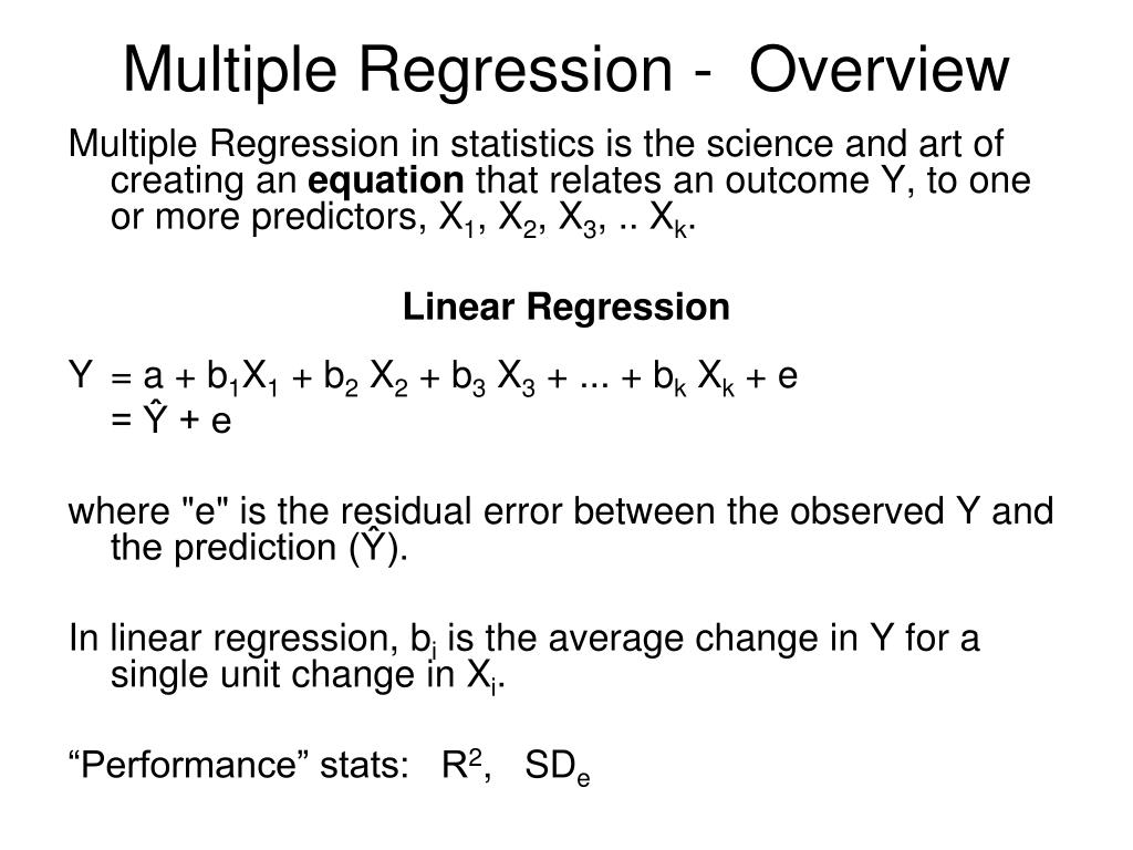Multiple Regression - Overview Multiple Regression in statistics is the science and art of creating an equation that relates an outcome Y, to one or more predictors, X1, X2, X3, .. Xk. Linear Regression Y = a + b1X1 + b2 X2 + b3 X3 + ... + bk Xk + e = Ŷ + e where "e" is the residual error between the observed Y and the prediction (Ŷ). In linear regression, bi is the average change in Y for a single unit change in Xi. “Performance” stats: R2, SDe