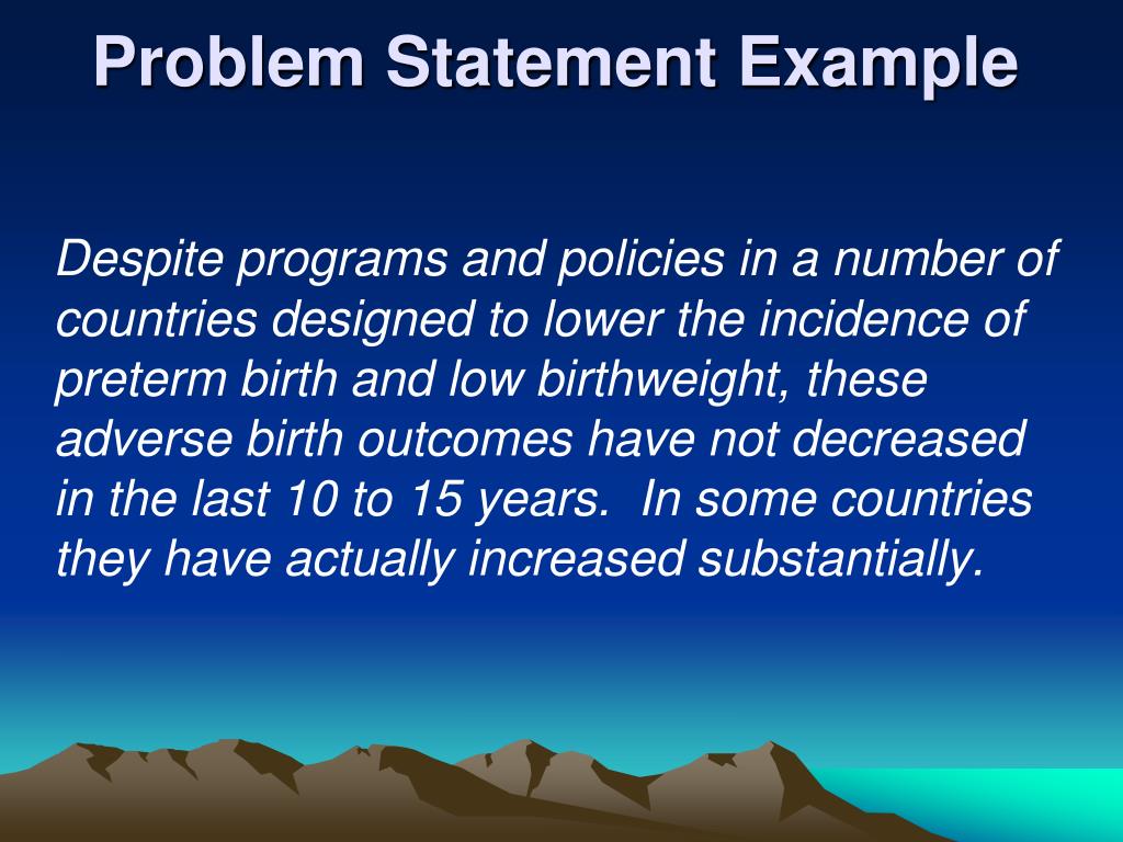 Problem Statement Example Despite programs and policies in a number of countries designed to lower the incidence of preterm birth and low birthweight, these adverse birth outcomes have not decreased in the last 10 to 15 years. In some countries they have actually increased substantially.