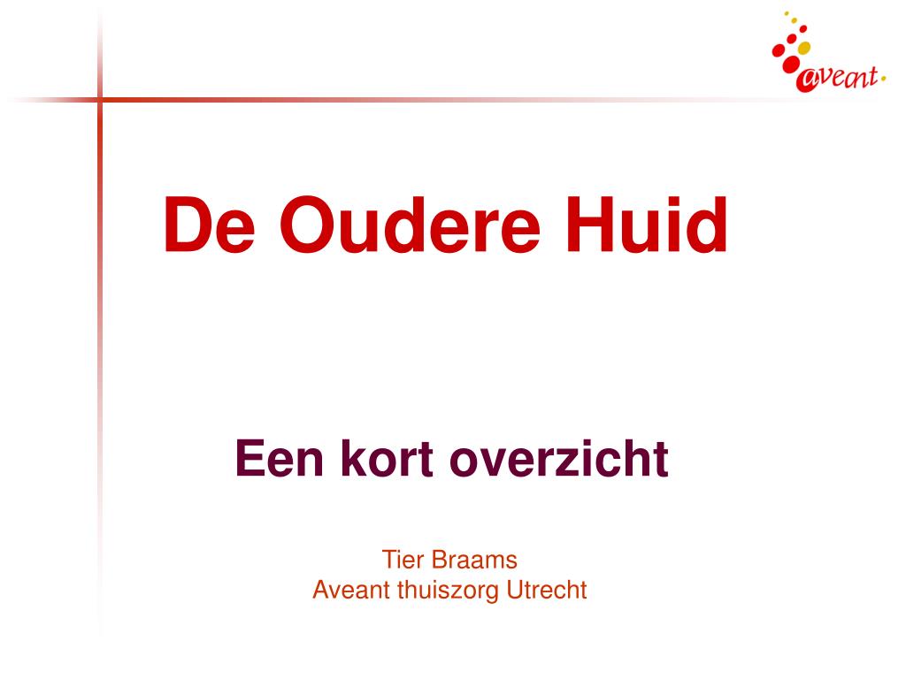 De Oudere Huid. Een kort overzicht. Tier Braams Aveant thuiszorg Utrecht. Oudere huid Smetten Vocht/incontinentie Skin Tears. Welke problemen. De Huid. De Oudere Huid. Verslapte huid Rimpels Diepe groeven Ouderdomsvlekken Verliest vermogen vocht vast te houden Minder bloedvaatjes