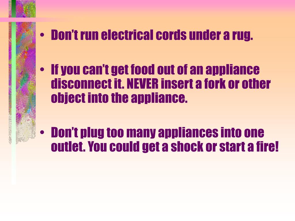 Don’t run electrical cords under a rug. • If you can’t get food out of an appliance disconnect it. NEVER insert a fork or other object into the appliance. • Don’t plug too many appliances into one outlet. You could get a shock or start a fire!