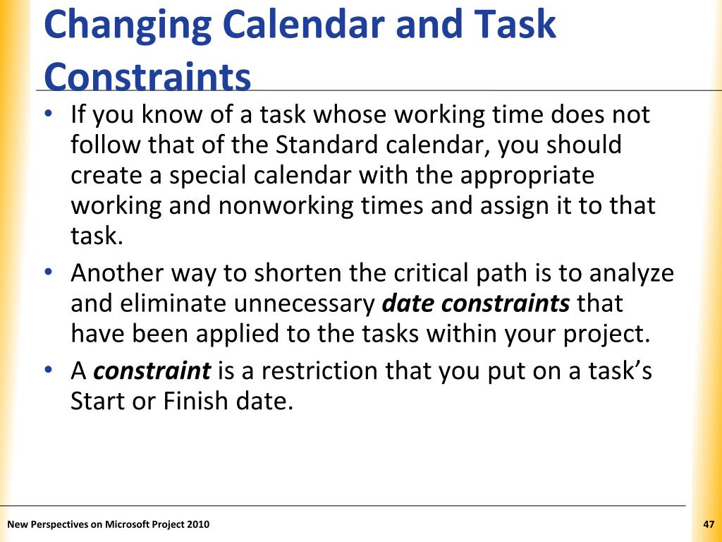 Changing Calendar and Task Constraints • If you know of a task whose working time does not follow that of the Standard calendar, you should create a special calendar with the appropriate working and nonworking times and assign it to that task. • Another way to shorten the critical path is to analyze and eliminate unnecessary date constraints that have been applied to the tasks within your project. • A constraint is a restriction that you put on a task’s Start or Finish date. New Perspectives on Microsoft Project 2010