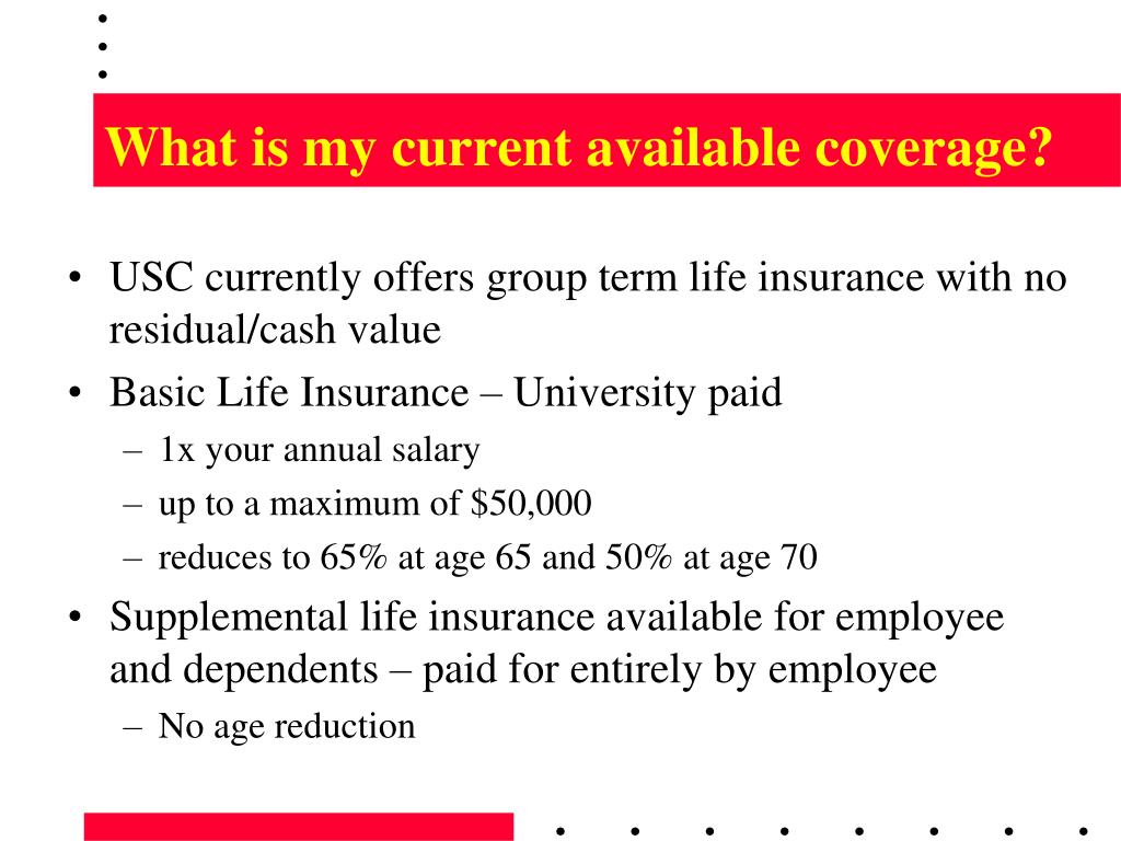 What is my current available coverage? • USC currently offers group term life insurance with no residual/cash value • Basic Life Insurance – University paid • 1x your annual salary • up to a maximum of $50,000 • reduces to 65% at age 65 and 50% at age 70 • Supplemental life insurance available for employee and dependents – paid for entirely by employee • No age reduction