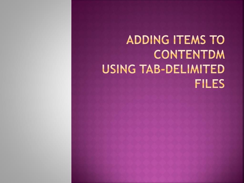 Adding Items to CONTENTdm Using Tab-Delimited Files. How to add multiple items to Project Client How to add compound objects How to add a structured compound object. Getting organized. Project settings. Your .txt file. Import metadata. Import image files. Map your fields.