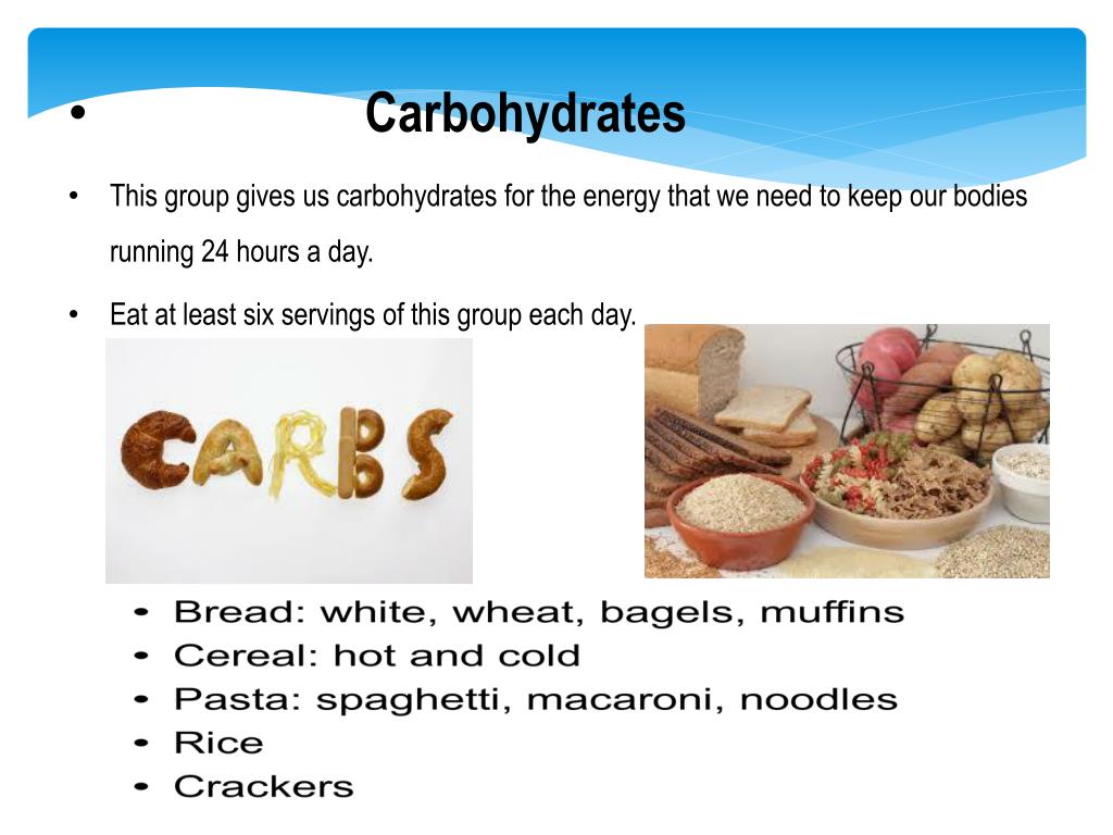 Carbohydrates • This group gives us carbohydrates for the energy that we need to keep our bodies running 24 hours a day. • Eat at least six servings of this group each day.