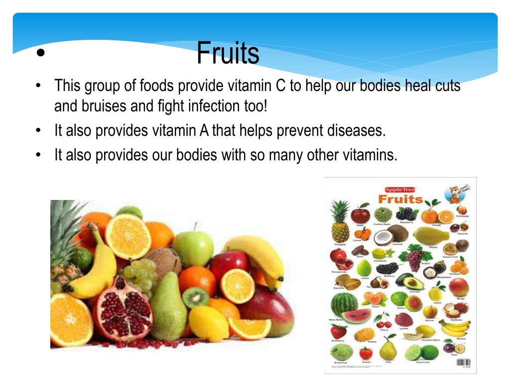 Fruits • This group of foods provide vitamin C to help our bodies heal cuts and bruises and fight infection too! • It also provides vitamin A that helps prevent diseases. • It also provides our bodies with so many other vitamins.