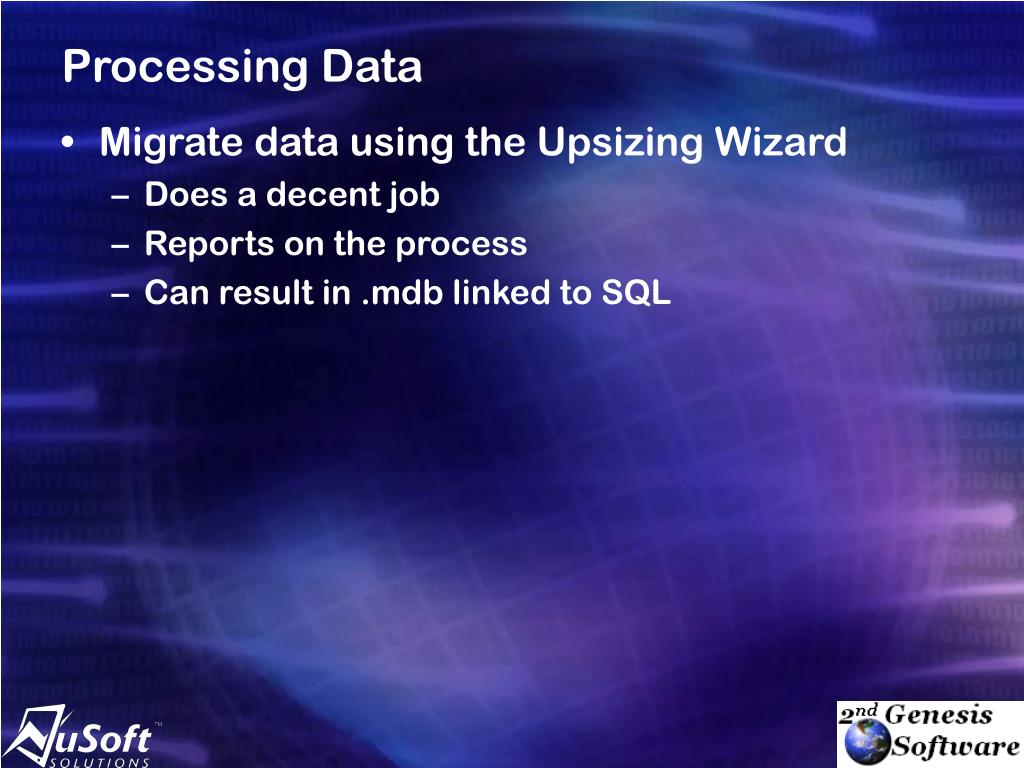 Processing Data • Migrate data using the Upsizing Wizard • Does a decent job • Reports on the process • Can result in .mdb linked to SQL