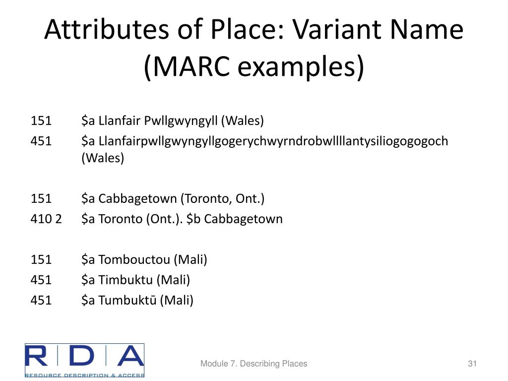 Attributes of Place: Variant Name (MARC examples) 151 $a Llanfair Pwllgwyngyll (Wales) 451 $a Llanfairpwllgwyngyllgogerychwyrndrobwllllantysiliogogogoch (Wales) 151 $a Cabbagetown (Toronto, Ont.) 410 2 $a Toronto (Ont.). $b Cabbagetown 151 $a Tombouctou (Mali) 451 $a Timbuktu (Mali) 451 $aTumbuktū (Mali) Module 7. Describing Places