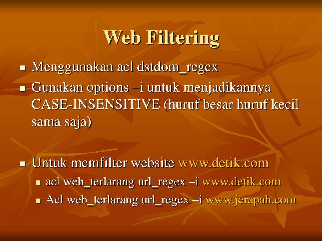 Web Filtering • Menggunakan acl dstdom_regex • Gunakan options –i untuk menjadikannya CASE-INSENSITIVE (huruf besar huruf kecil sama saja) • Untuk memfilter website www.detik.com • acl web_terlarang url_regex –i www.detik.com • Acl web_terlarang url_regex –i www.jerapah.com