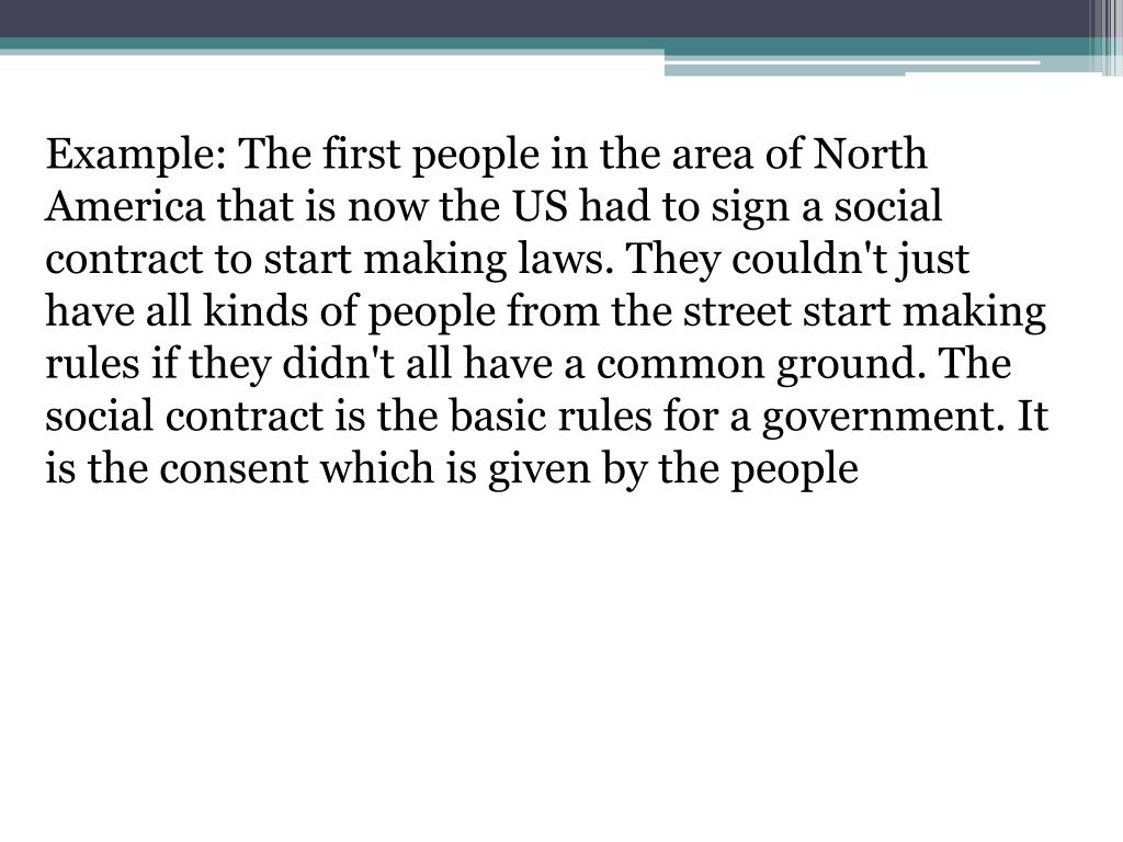 Example: The first people in the area of North America that is now the US had to sign a social contract to start making laws. They couldn't just have all kinds of people from the street start making rules if they didn't all have a common ground. The social contract is the basic rules for a government. It is the consent which is given by the people