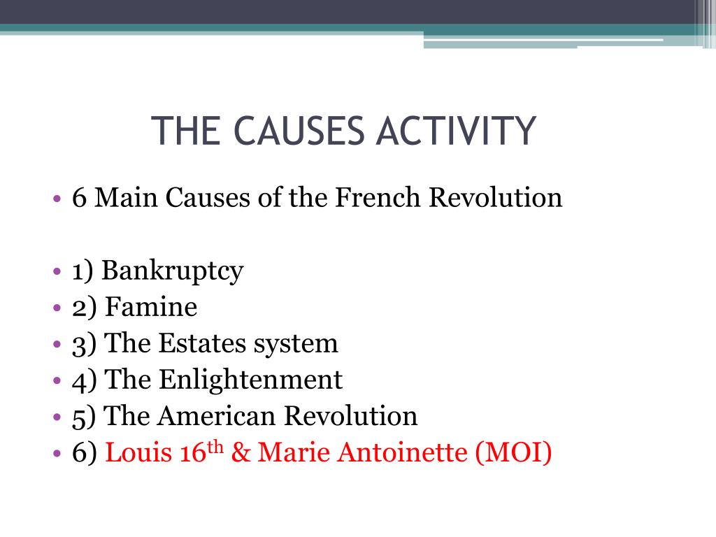 THE CAUSES ACTIVITY • 6 Main Causes of the French Revolution • 1) Bankruptcy • 2) Famine • 3) The Estates system • 4) The Enlightenment • 5) The American Revolution • 6) Louis 16th & Marie Antoinette (MOI)