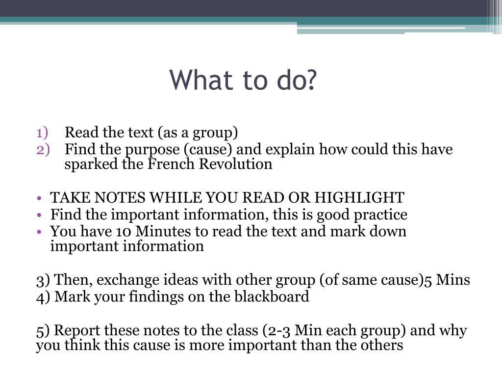 What to do? • Read the text (as a group) • Find the purpose (cause) and explain how could this have sparked the French Revolution • TAKE NOTES WHILE YOU READ OR HIGHLIGHT • Find the important information, this is good practice • You have 10 Minutes to read the text and mark down important information 3) Then, exchange ideas with other group (of same cause)5 Mins 4) Mark your findings on the blackboard 5) Report these notes to the class (2-3 Min each group) and why you think this cause is more important than the others