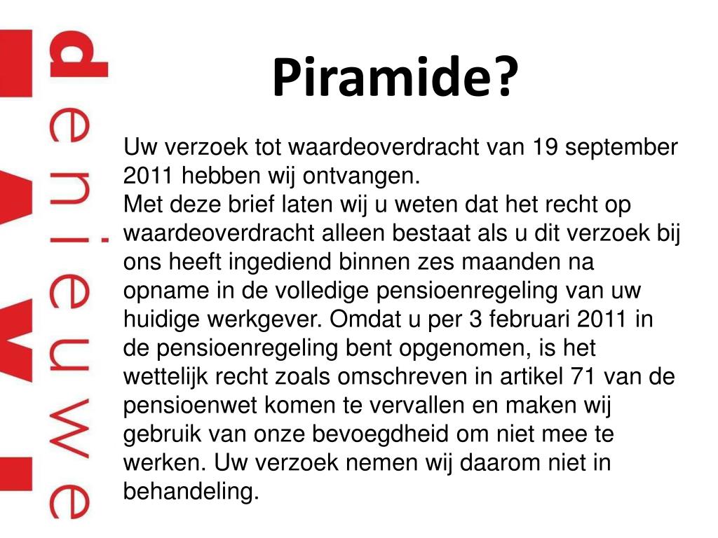 Piramide? Uw verzoek tot waardeoverdracht van 19 september 2011 hebben wij ontvangen. Met deze brief laten wij u weten dat het recht op waardeoverdracht alleen bestaat als u dit verzoek bij ons heeft ingediend binnen zes maanden na opname in de volledige pensioenregeling van uw huidige werkgever. Omdat u per 3 februari 2011 in de pensioenregeling bent opgenomen, is het wettelijk recht zoals omschreven in artikel 71 van de pensioenwet komen te vervallen en maken wij gebruik van onze bevoegdheid om niet mee te werken. Uw verzoek nemen wij daarom niet in behandeling.