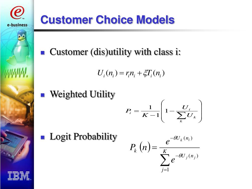 Customer Choice Models • Customer (dis)utility with class i: • Weighted Utility • Logit Probability