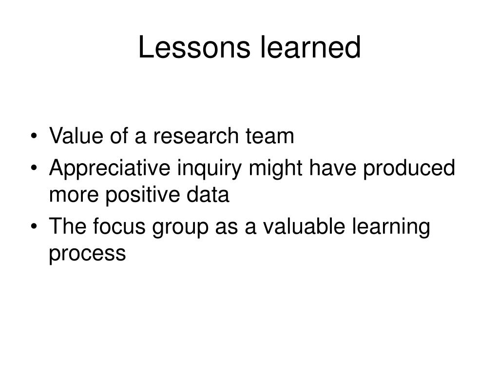 Lessons learned • Value of a research team • Appreciative inquiry might have produced more positive data • The focus group as a valuable learning process