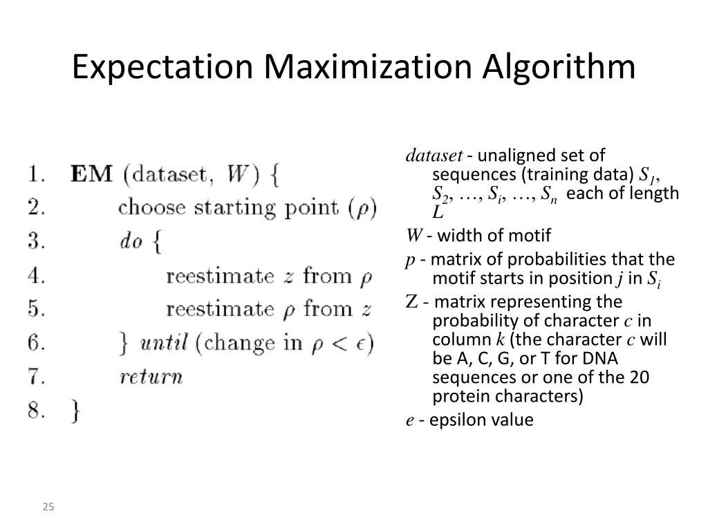 Expectation Maximization Algorithm dataset - unaligned set of sequences (training data) S1, S2, …, Si, …, Sn each of length L W - width of motif p - matrix of probabilities that the motif starts in position jin Si Z - matrix representing the probability of character c in column k(the character c will be A, C, G, or T for DNA sequences or one of the 20 protein characters) e - epsilon value