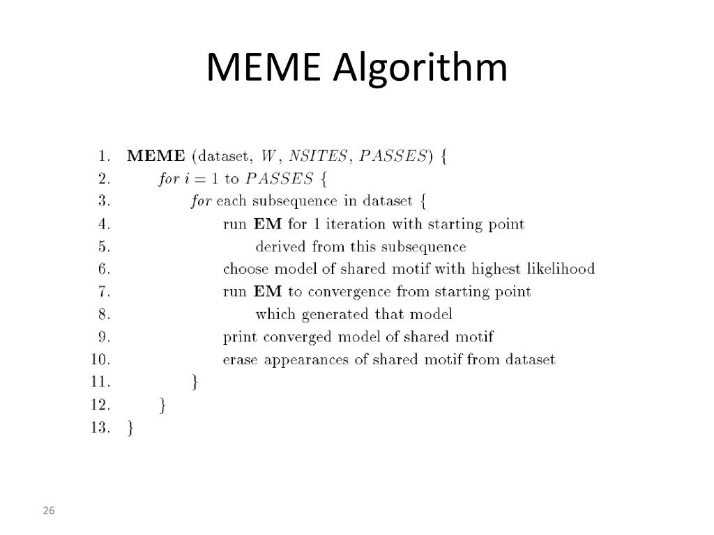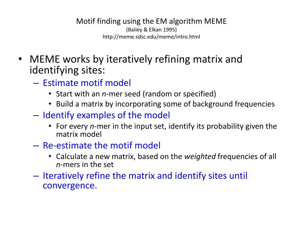 Motif finding using the EM algorithm MEME (Bailey & Elkan 1995)http://meme.sdsc.edu/meme/intro.html • MEME works by iteratively refining matrix and identifying sites: • Estimate motif model • Start with an n-mer seed (random or specified) • Build a matrix by incorporating some of background frequencies • Identify examples of the model • For every n-mer in the input set, identify its probability given the matrix model • Re-estimate the motif model • Calculate a new matrix, based on the weighted frequencies of all n-mers in the set • Iteratively refine the matrix and identify sites until convergence.