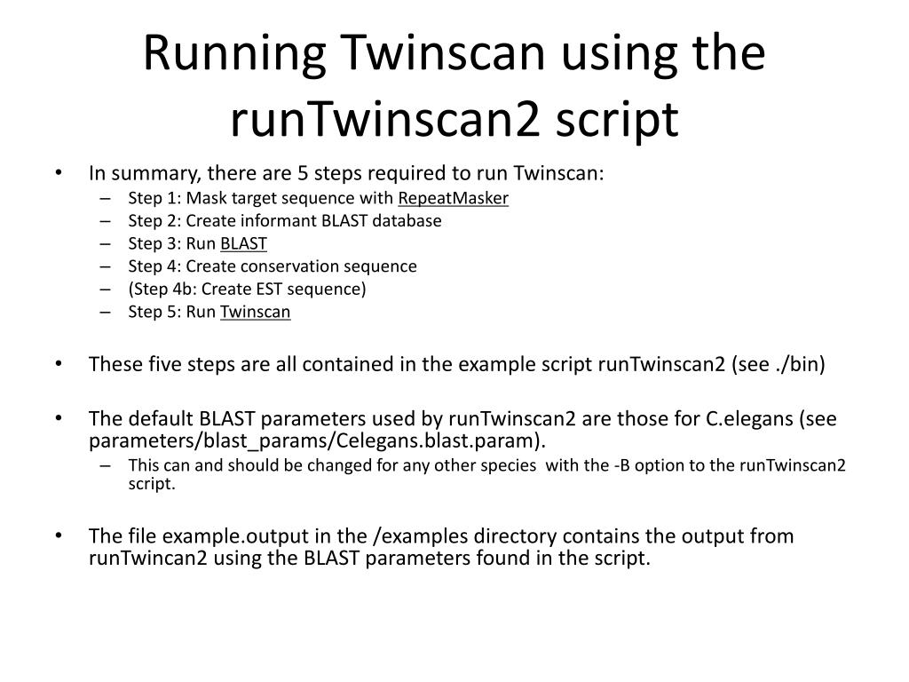 Running Twinscan using the runTwinscan2 script • In summary, there are 5 steps required to run Twinscan: • Step 1: Mask target sequence with RepeatMasker • Step 2: Create informant BLAST database • Step 3: Run BLAST • Step 4: Create conservation sequence • (Step 4b: Create EST sequence) • Step 5: Run Twinscan • These five steps are all contained in the example script runTwinscan2 (see ./bin) • The default BLAST parameters used by runTwinscan2 are those for C.elegans (see parameters/blast_params/Celegans.blast.param). • This can and should be changed for any other species with the -B option to the runTwinscan2 script. • The file example.output in the /examples directory contains the output from runTwincan2 using the BLAST parameters found in the script.