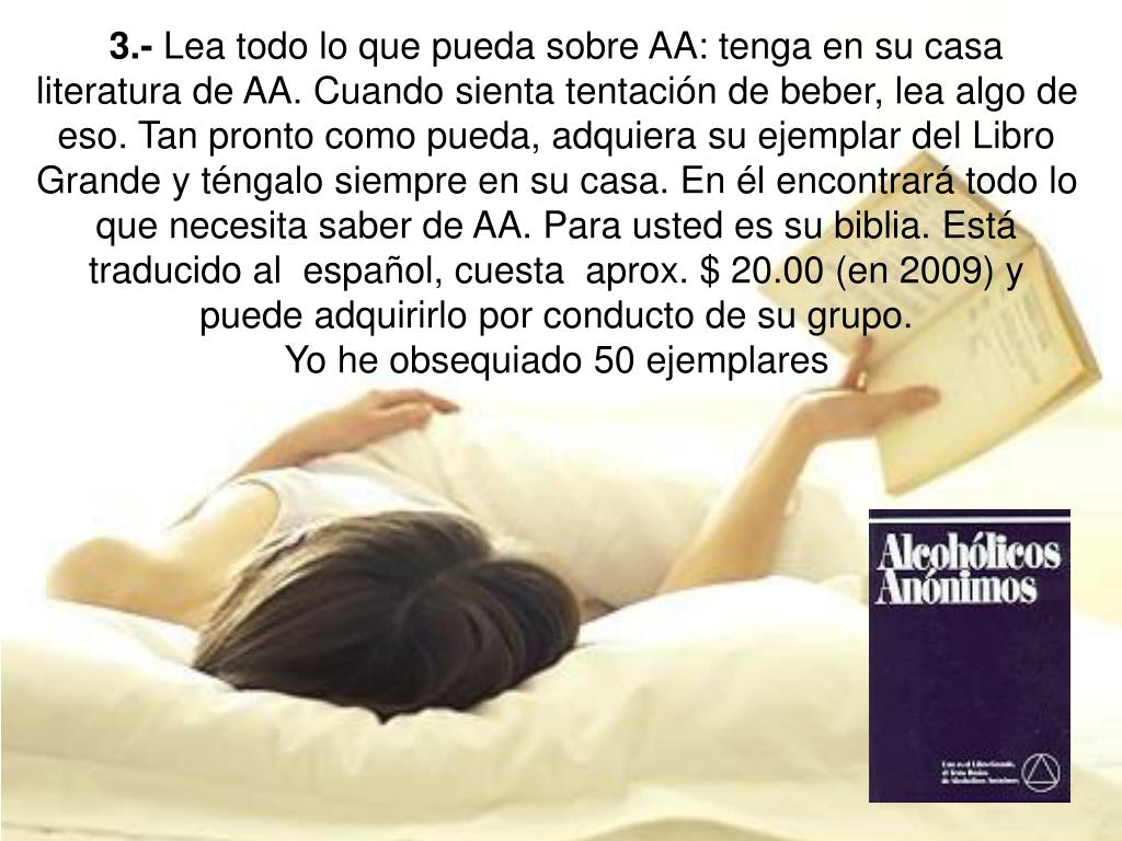 3.- Lea todo lo que pueda sobre AA: tenga en su casa literatura de AA. Cuando sienta tentación de beber, lea algo de eso. Tan pronto como pueda, adquiera su ejemplar del Libro Grande y téngalo siempre en su casa. En él encontrará todo lo que necesita saber de AA. Para usted es su biblia. Está traducido al español, cuesta aprox. $ 20.00 (en 2009) y puede adquirirlo por conducto de su grupo. Yo he obsequiado 50 ejemplares