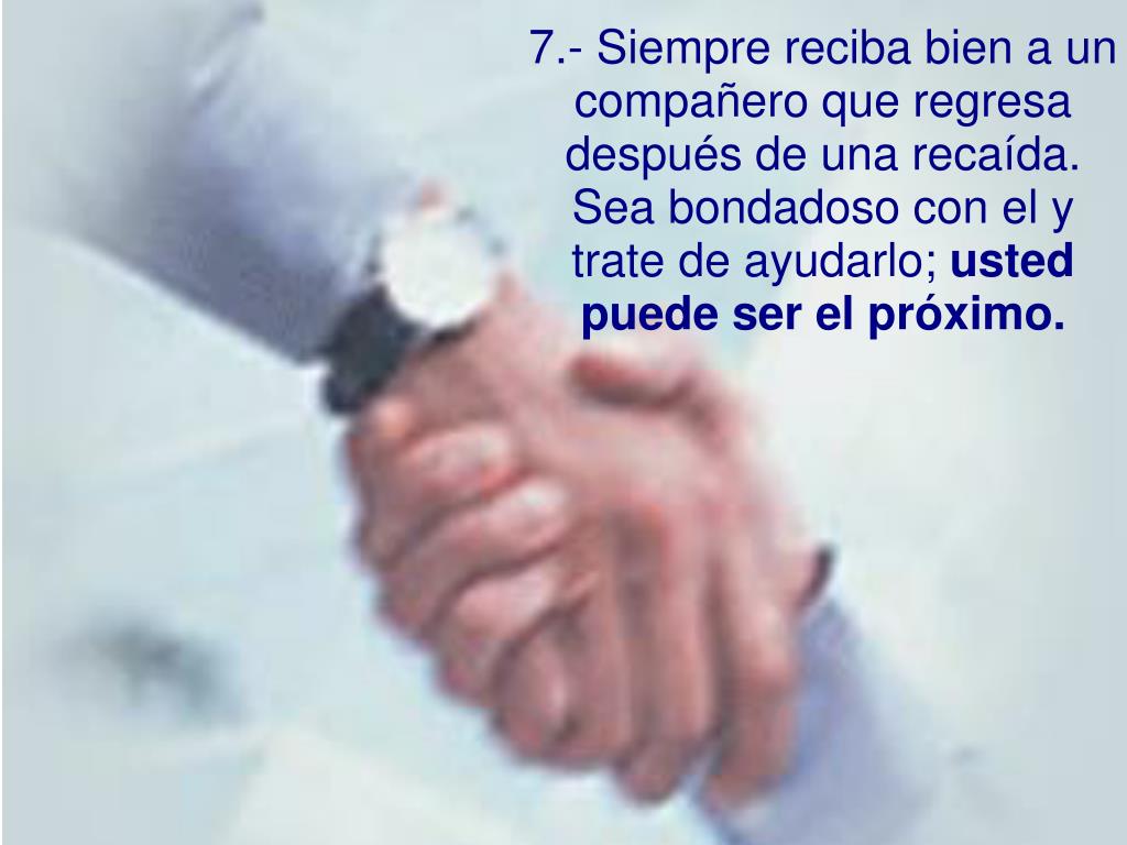 7.- Siempre reciba bien a un compañero que regresa después de una recaída. Sea bondadoso con el y trate de ayudarlo; usted puede ser el próximo.