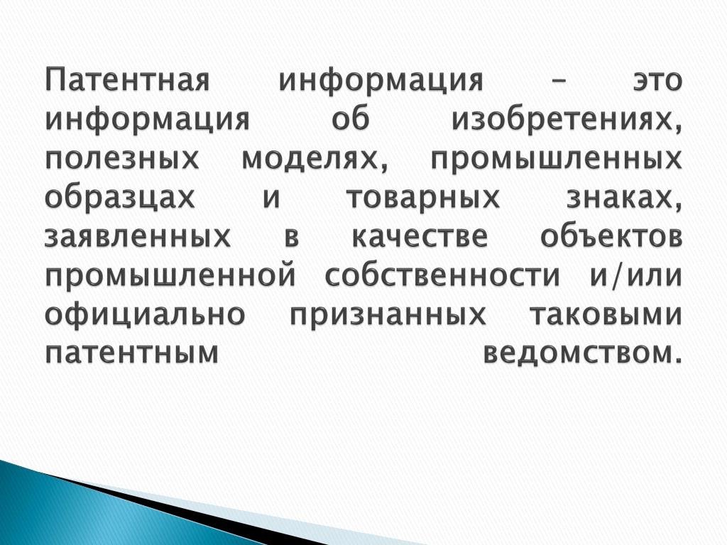Патентная информация – это информация об изобретениях, полезных моделях, промышленных образцах и товарных знаках, заявленных в качестве объектов промышленной собственности и/или официально признанных таковыми патентным ведомством.