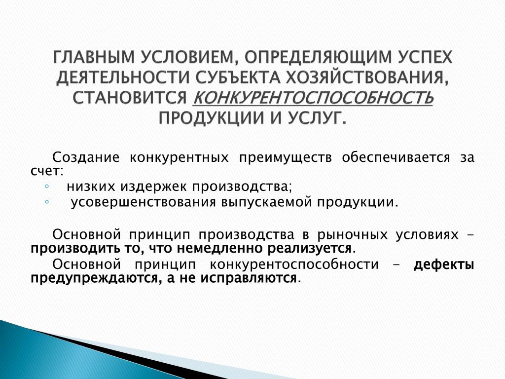 ГЛАВНЫМ УСЛОВИЕМ, ОПРЕДЕЛЯЮЩИМ УСПЕХ ДЕЯТЕЛЬНОСТИ СУБЪЕКТА ХОЗЯЙСТВОВАНИЯ, СТАНОВИТСЯ КОНКУРЕНТОСПОСОБНОСТЬ ПРОДУКЦИИ И УСЛУГ. Создание конкурентных преимуществ обеспечивается за счет: • низких издержек производства; • усовершенствования выпускаемой продукции. Основной принцип производства в рыночных условиях - производить то, что немедленно реализуется. Основной принцип конкурентоспособности - дефекты предупреждаются, а не исправляются.