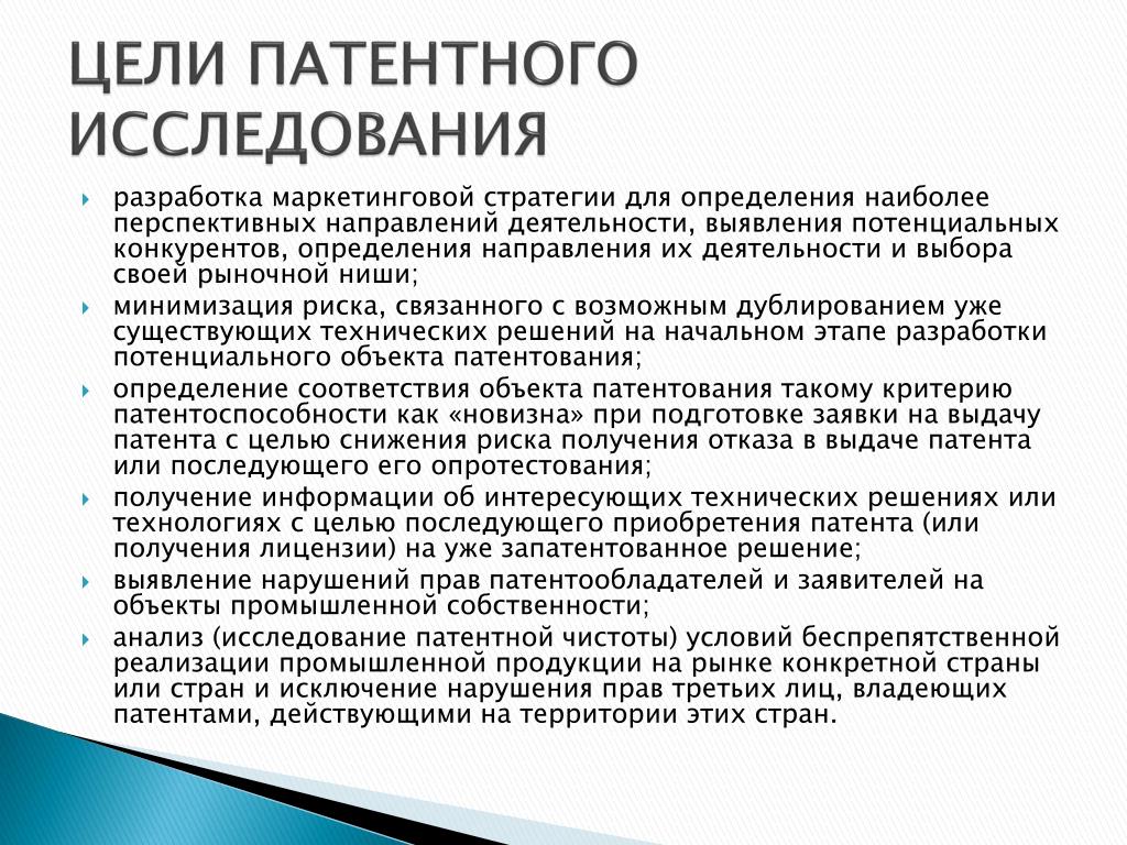 ЦЕЛИ ПАТЕНТНОГО ИССЛЕДОВАНИЯ • разработка маркетинговой стратегии для определения наиболее перспективных направлений деятельности, выявления потенциальных конкурентов, определения направления их деятельности и выбора своей рыночной ниши; • минимизация риска, связанного с возможным дублированием уже существующих технических решений на начальном этапе разработки потенциального объекта патентования; • определение соответствия объекта патентования такому критерию патентоспособности как «новизна» при подготовке заявки на выдачу патента с целью снижения риска получения отказа в выдаче патента или последующего его опротестования; • получение информации об интересующих технических решениях или технологиях с целью последующего приобретения патента (или получения лицензии) на уже запатентованное решение; • выявление нарушений прав патентообладателей и заявителей на объекты промышленной собственности; • анализ (исследование патентной чистоты) условий беспрепятственной реализации промышленной продукции на рынке конкретной страны или стран и исключение нарушения прав третьих лиц, владеющих патентами, действующими на территории этих стран.