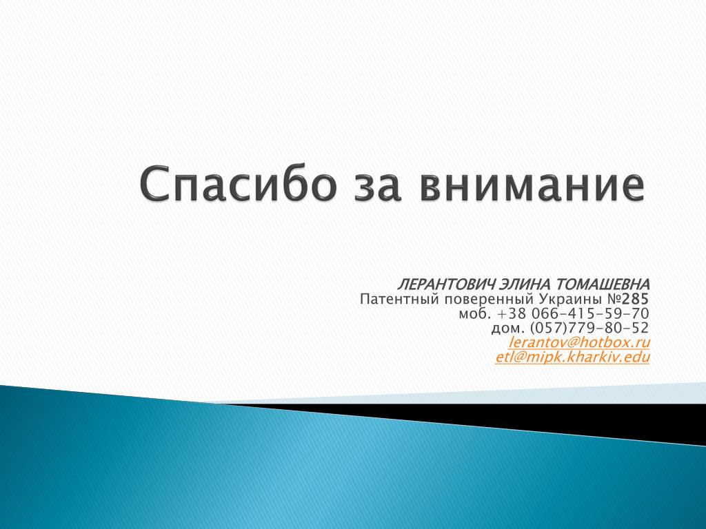 Спасибо за внимание ЛЕРАНТОВИЧ ЭЛИНА ТОМАШЕВНА Патентный поверенный Украины №285 моб. +38 066-415-59-70 дом. (057)779-80-52 lerantov@hotbox.ru etl@mipk.kharkiv.edu