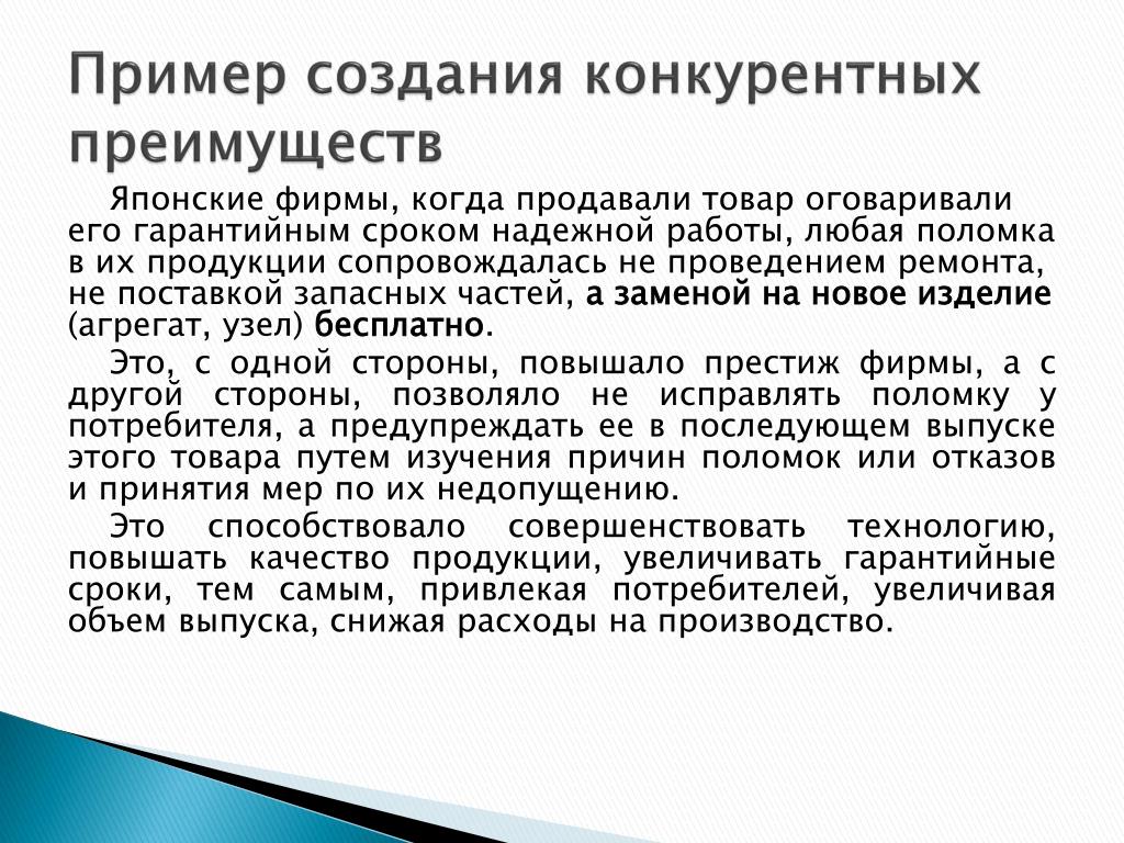 Пример создания конкурентных преимуществ Японские фирмы, когда продавали товар оговаривали его гарантийным сроком надежной работы, любая поломка в их продукции сопровождалась не проведением ремонта, не поставкой запасных частей, а заменой на новое изделие (агрегат, узел) бесплатно. Это, с одной стороны, повышало престиж фирмы, а с другой стороны, позволяло не исправлять поломку у потребителя, а предупреждать ее в последующем выпуске этого товара путем изучения причин поломок или отказов и принятия мер по их недопущению. Это способствовало совершенствовать технологию, повышать качество продукции, увеличивать гарантийные сроки, тем самым, привлекая потребителей, увеличивая объем выпуска, снижая расходы на производство.
