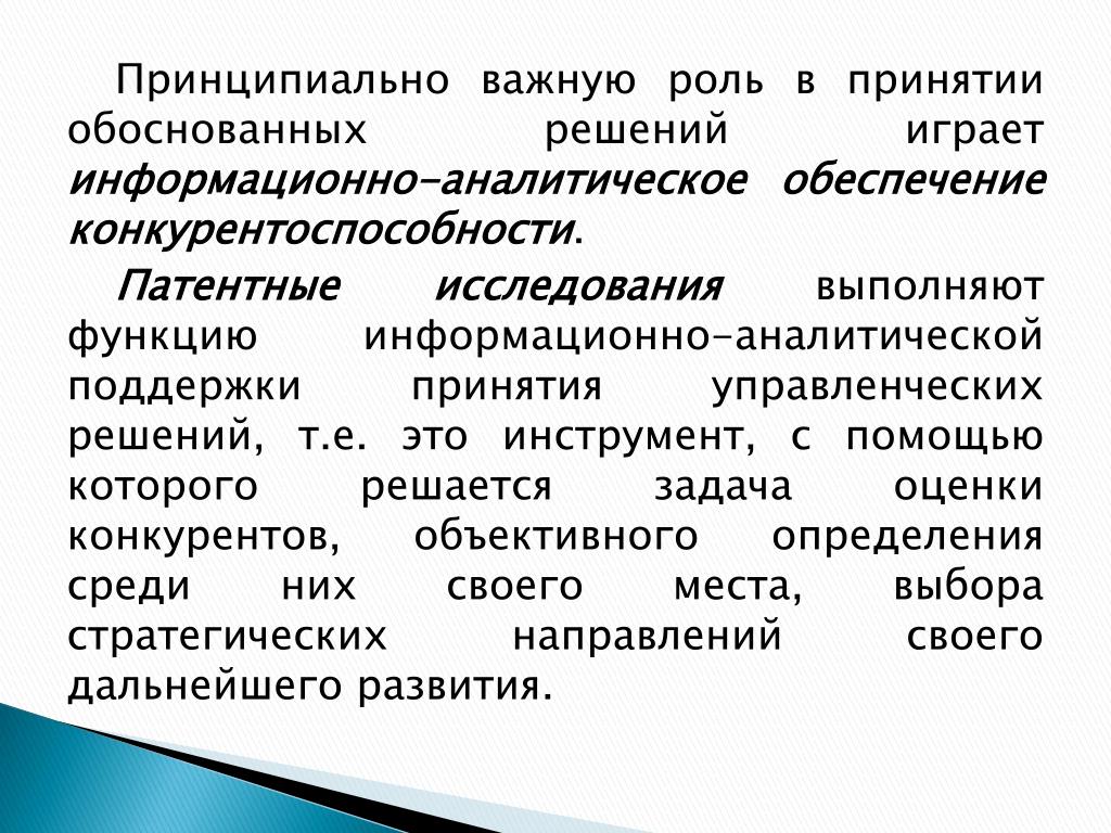 Принципиально важную роль в принятии обоснованных решений играет информационно-аналитическое обеспечение конкурентоспособности. Патентные исследованиявыполняют функцию информационно-аналитической поддержки принятия управленческих решений, т.е. это инструмент, с помощью которого решается задача оценки конкурентов, объективного определения среди них своего места, выбора стратегических направлений своего дальнейшего развития.