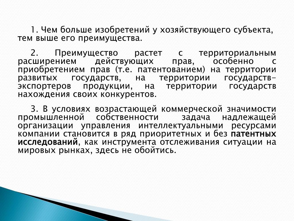 1. Чем больше изобретений у хозяйствующего субъекта, тем выше его преимущества. 2. Преимущество растет с территориальным расширением действующих прав, особенно с приобретением прав (т.е. патентованием) на территории развитых государств, на территории государств-экспортеров продукции, на территории государств нахождения своих конкурентов. 3. В условиях возрастающей коммерческой значимости промышленной собственности задача надлежащей организации управления интеллектуальными ресурсами компании становится в ряд приоритетных и без патентных исследований, как инструмента отслеживания ситуации на мировых рынках, здесь не обойтись.