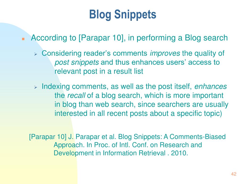 Blog Snippets • According to [Parapar 10], in performing a Blog search • Considering reader’s comments improves the quality of post snippets and thus enhances users’ access to relevant post in a result list • Indexing comments, as well as the post itself, enhances the recall of a blog search, which is more important in blog than web search, since searchers are usually interested in all recent posts about a specific topic) • [Parapar 10] J. Parapar et al. Blog Snippets: A Comments-Biased Approach. In Proc. of Intl. Conf. on Research and Development in Information Retrieval . 2010.