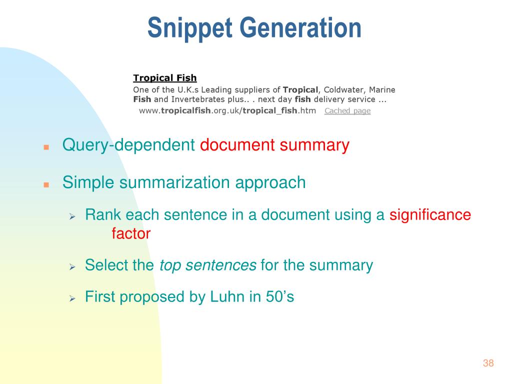 Snippet Generation • Query-dependent document summary • Simple summarization approach • Rank each sentence in a document using a significance factor • Select the top sentences for the summary • First proposed by Luhn in 50’s