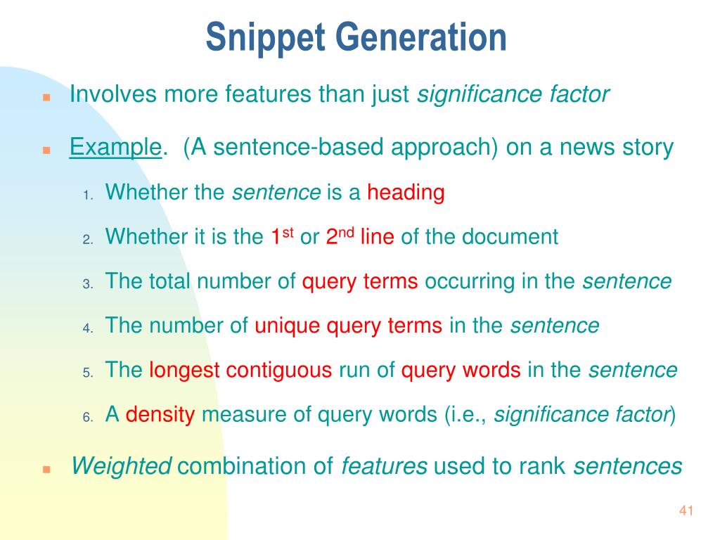 Snippet Generation • Involves more features than just significance factor • Example. (A sentence-based approach) on a news story • Whether the sentence is a heading • Whether it is the 1stor 2ndlineof the document • The total number of query terms occurring in the sentence • The number of unique query terms in the sentence • The longest contiguous run of query words in the sentence • A density measure of query words (i.e., significance factor) • Weighted combination of features used to rank sentences
