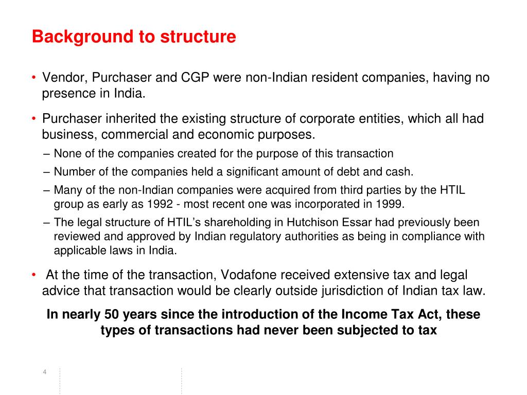 Background to structure • Vendor, Purchaser and CGP were non-Indian resident companies, having no presence in India. • Purchaser inherited the existing structure of corporate entities, which all had business, commercial and economic purposes. • None of the companies created for the purpose of this transaction • Number of the companies held a significant amount of debt and cash. • Many of the non-Indian companies were acquired from third parties by the HTIL group as early as 1992 - most recent one was incorporated in 1999. • The legal structure of HTIL’s shareholding in Hutchison Essar had previously been reviewed and approved by Indian regulatory authorities as being in compliance with applicable laws in India. • At the time of the transaction, Vodafone received extensive tax and legal advice that transaction would be clearly outside jurisdiction of Indian tax law. In nearly 50 years since the introduction of the Income Tax Act, these types of transactions had never been subjected to tax